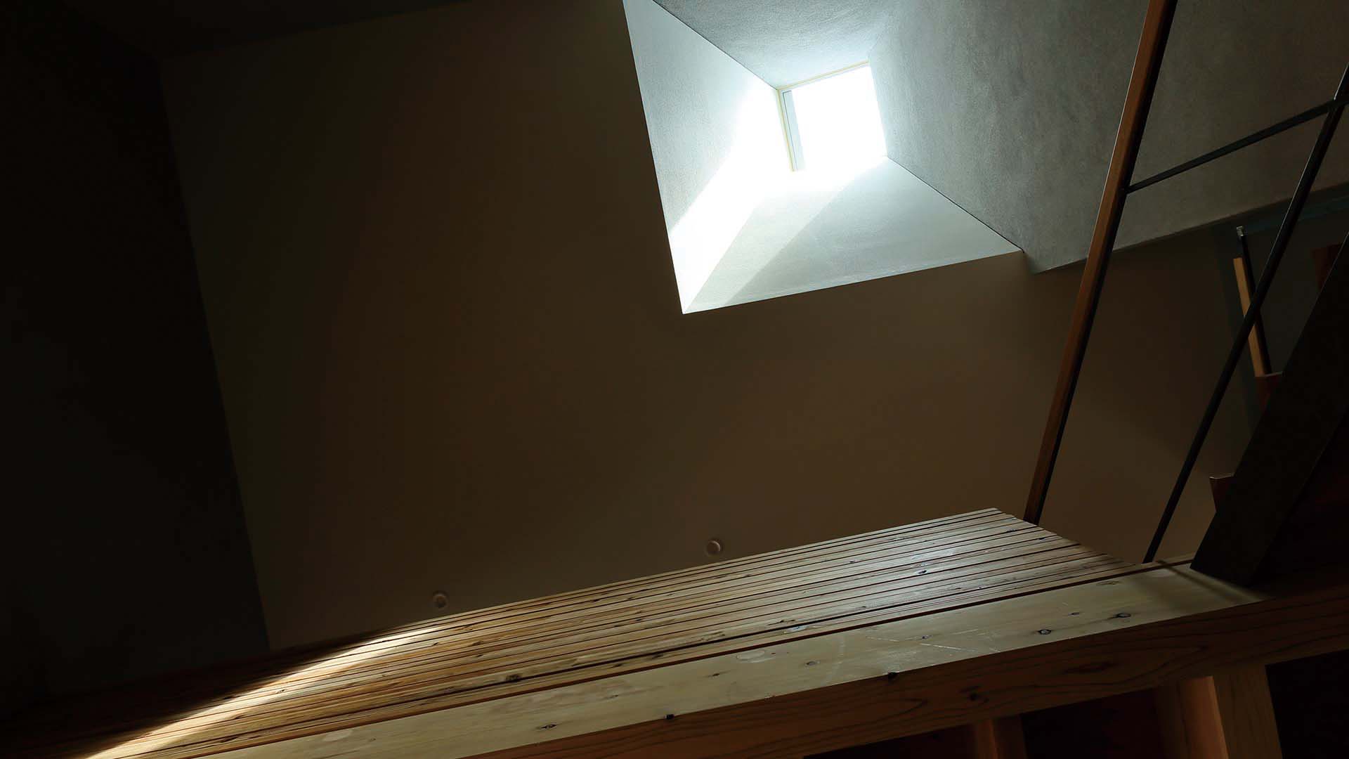 トップライトはサイズに制約があったため、天井面に向かって広がるメガホン状のデザインにすることで、小さな窓でも室内全体に大きな光を届けることが可能になりました。京都の町家に見られる走り庭の天窓のデザインを参考にし、自然光の届きにくい空間に光を落とす伝統的な手法を活かしています。