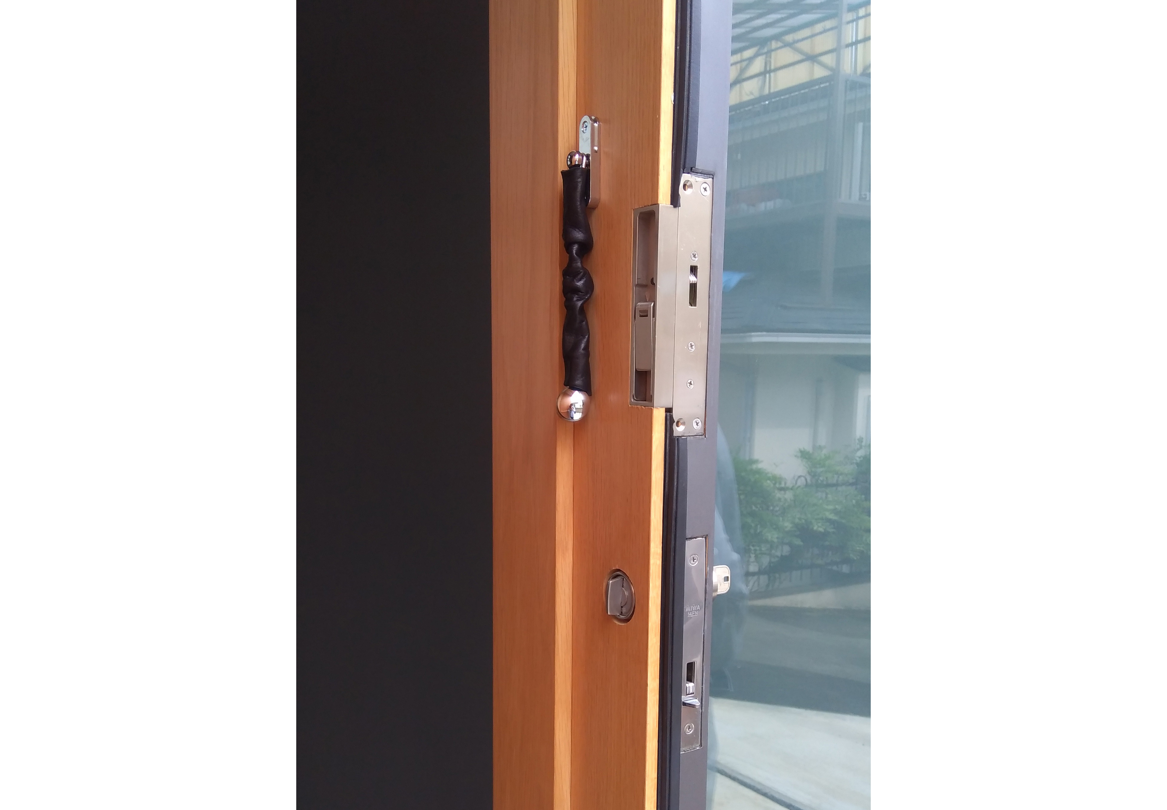 しかし、このドアは枠より外に扉を取り付け、枠にカマ式の錠を付けることで扉を枠側に引き寄せて締める形になり、鍵穴を側面に隠しています。
