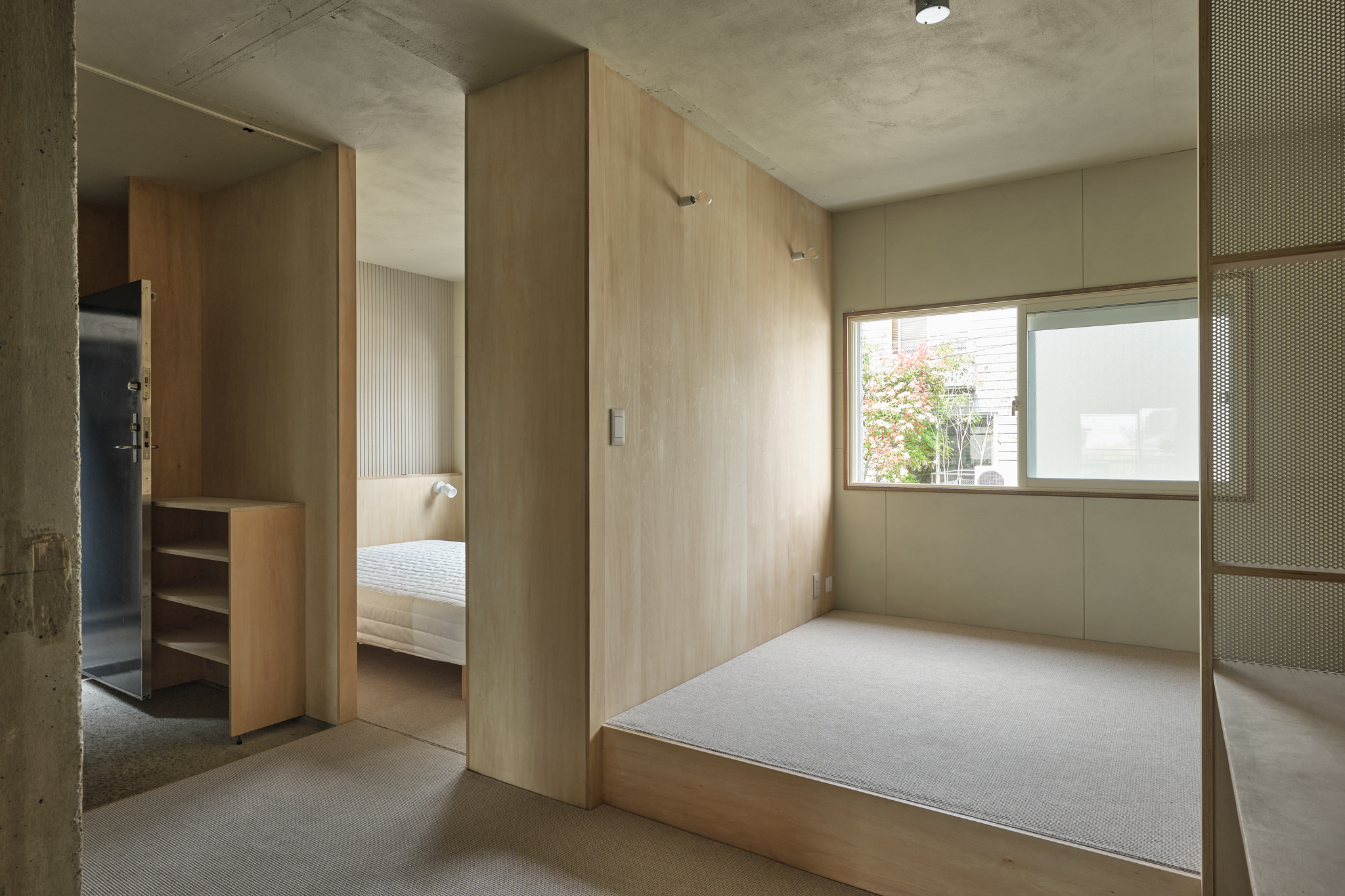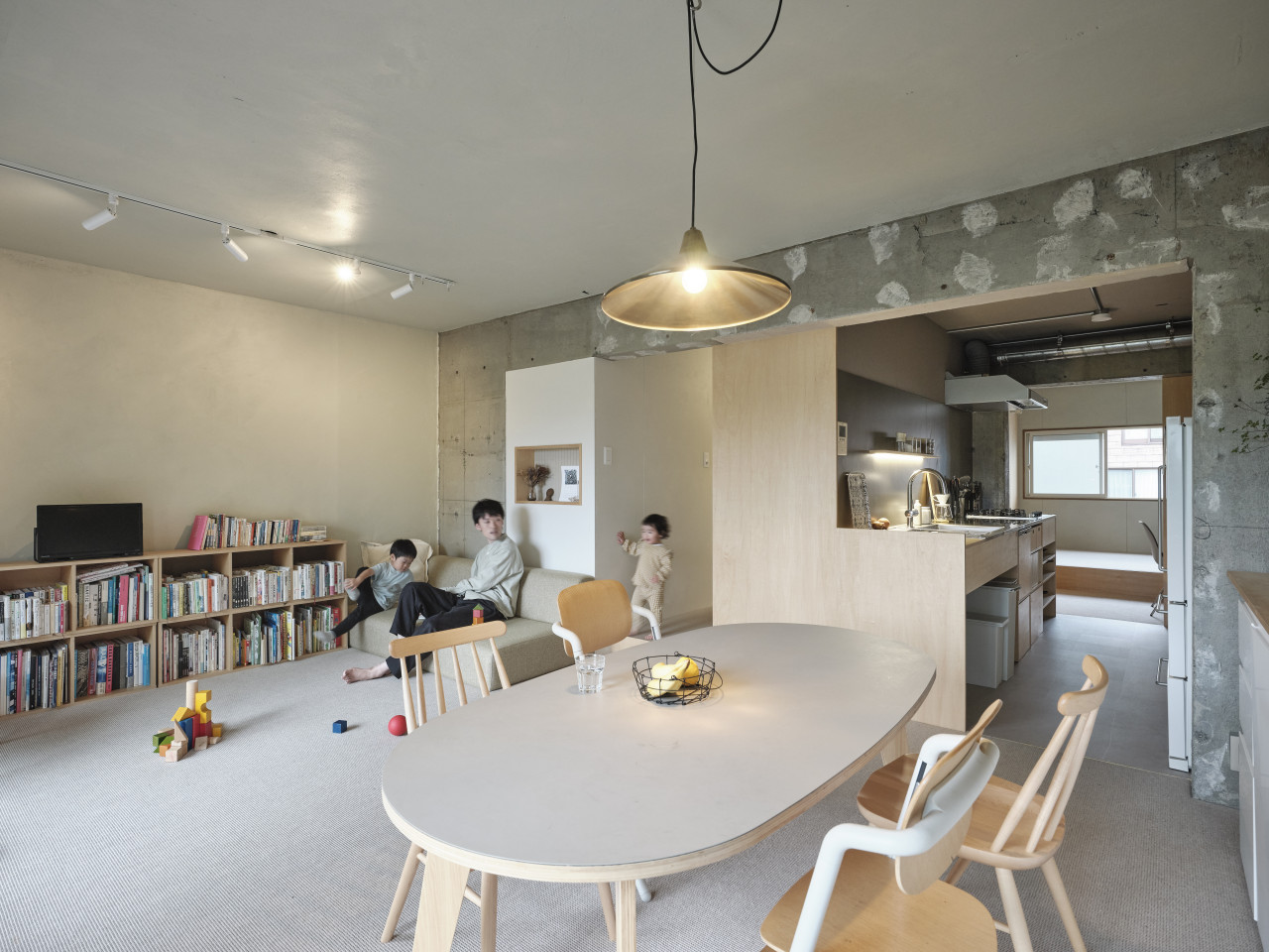 ゆるやかにつながるワンルームの空間に広がるのは、家族の暮らしに優しく寄り添う柔らかな印象のカーペット。家のどこでも気持ちよく過ごせる「床に近い暮らし」を目指しました。水回り以外のすべての床に採用したウールカーペットは、古い建物でも足元からの冷えを感じさせることがなく、下の階への音を響きにくくする効果も。北側には小上がりを設け、本来なら通行するだけの廊下も含めて多目的なスペースとして活躍します。