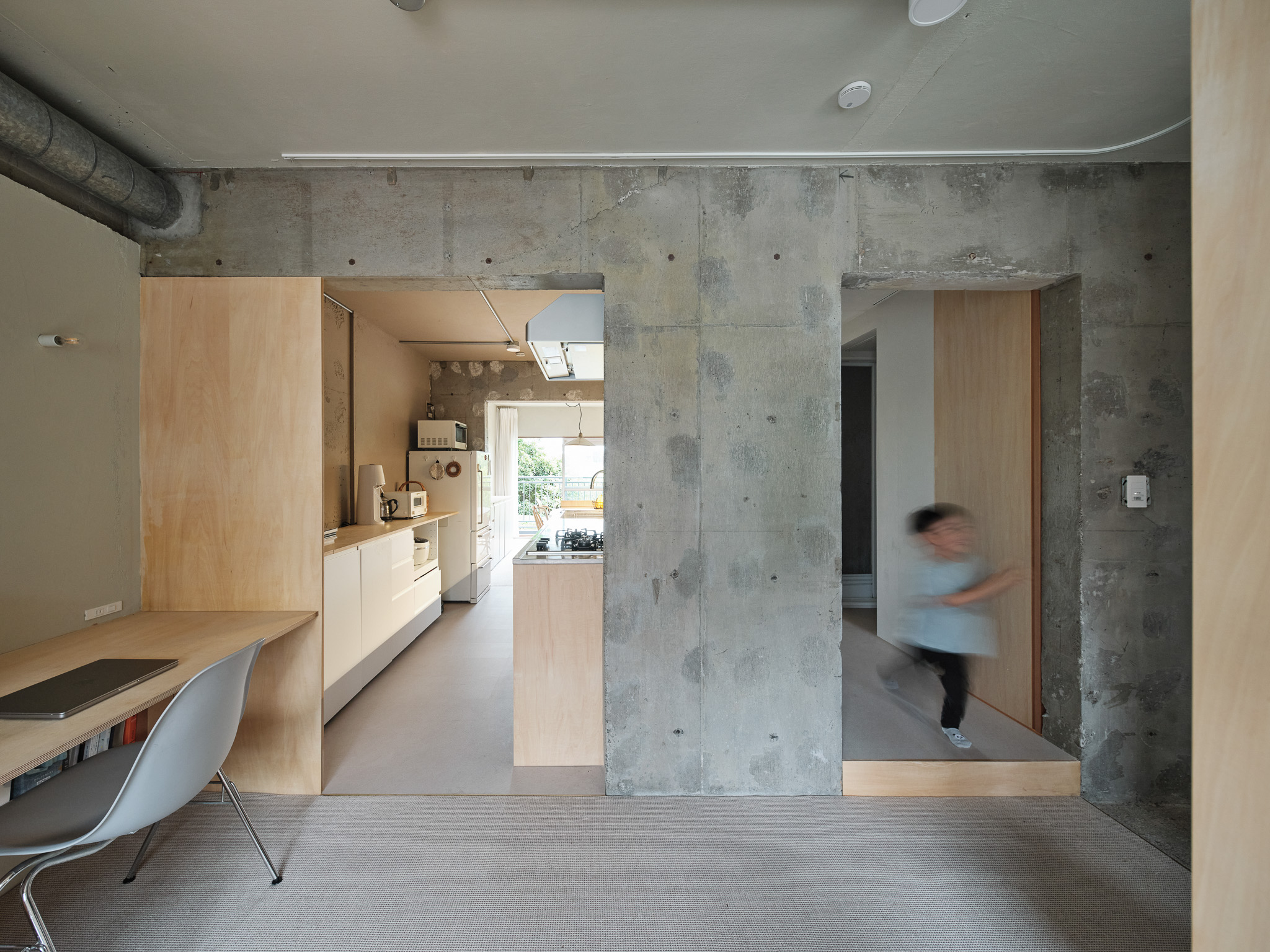東京の閑静な住宅街にあるヴィンテージマンションの1室。限られた空間を活かすため、2LDKの壁を取り除き、キッチンとサニタリーを中心にした回廊型のプランへリノベーションしました。