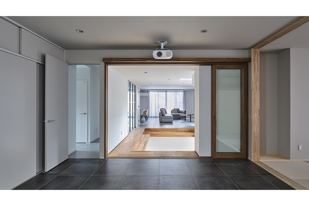 視覚的な「抜け感」も大切にしながら、天井と床の段差で空間を緩やかに分け、自由度の高い空間となりました。