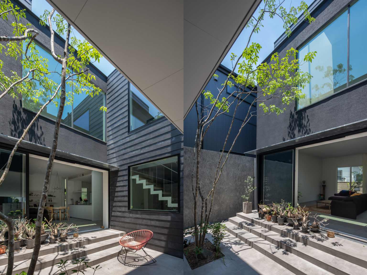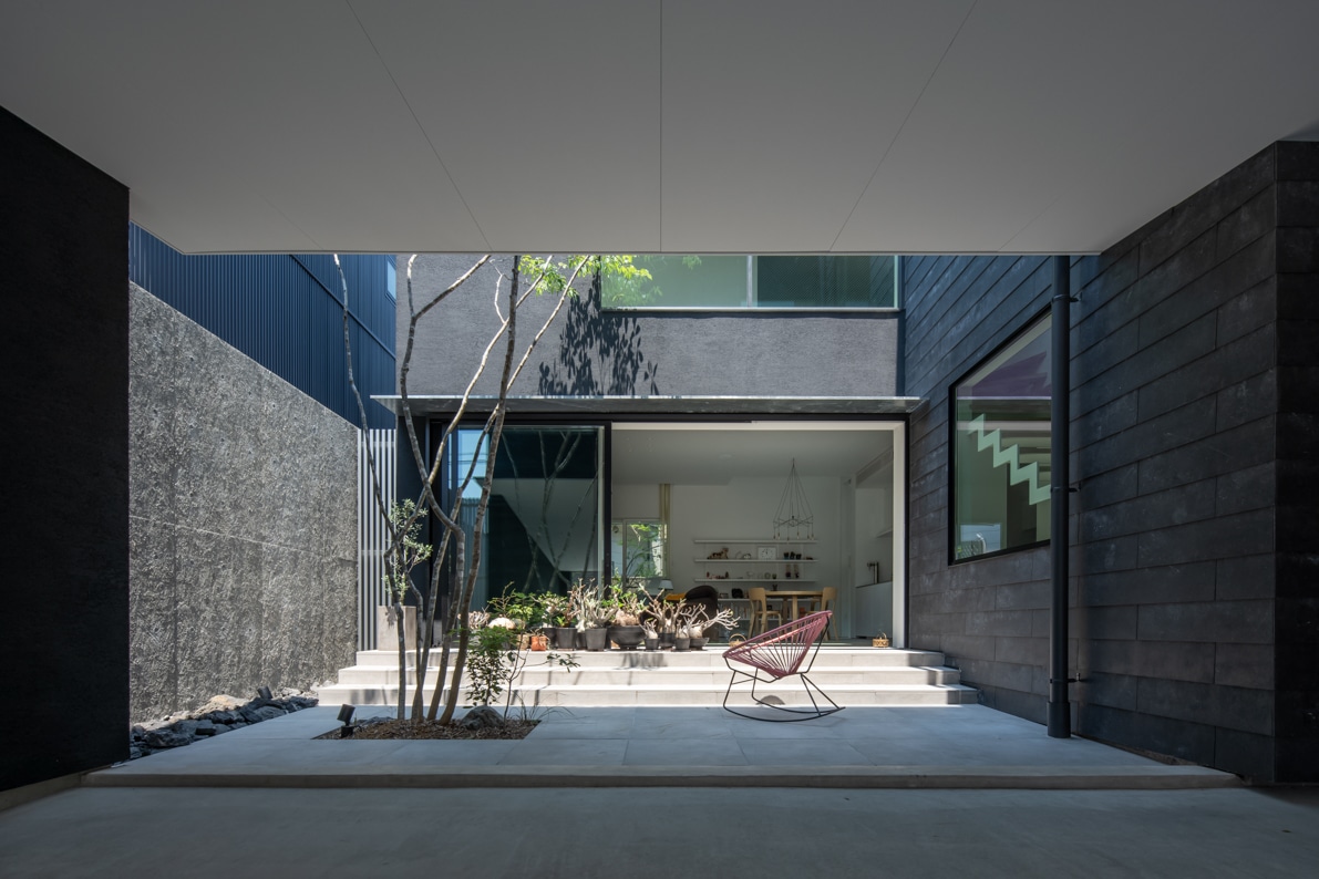土地の傾斜に合わせて中庭から数段階段を上った先にリビングを計画。