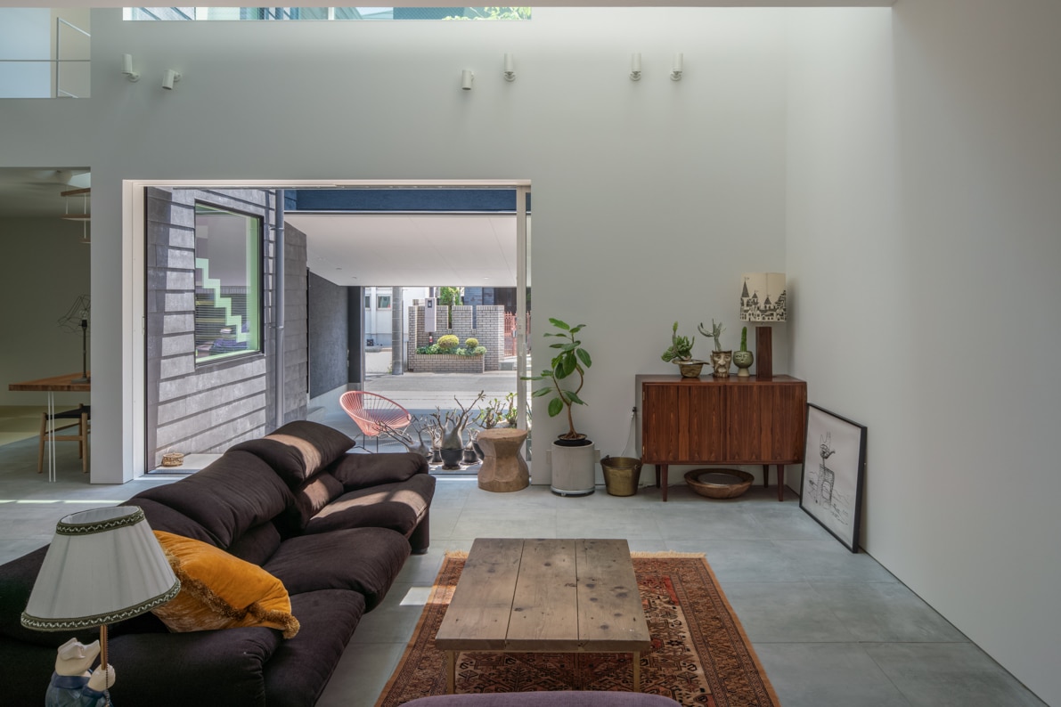 まず、入口から敷地の一番奥まで視線が届くよう大きな開口を設け、庭とガレージが自然とリビングへ続くようデザイン。ガレージと庭、リビングの床には同じタイルを採用することで、内外の一体感を図ります。 また、縦方向への広がりをつくるために、屋内には5つのトップライトを設置しました。見上げると空を感じ、光と影の変化が時間ごとに異なる表情を作り出し、それぞれの居場所で過ごしていても四季の移ろいや空の広がりを楽しめます。