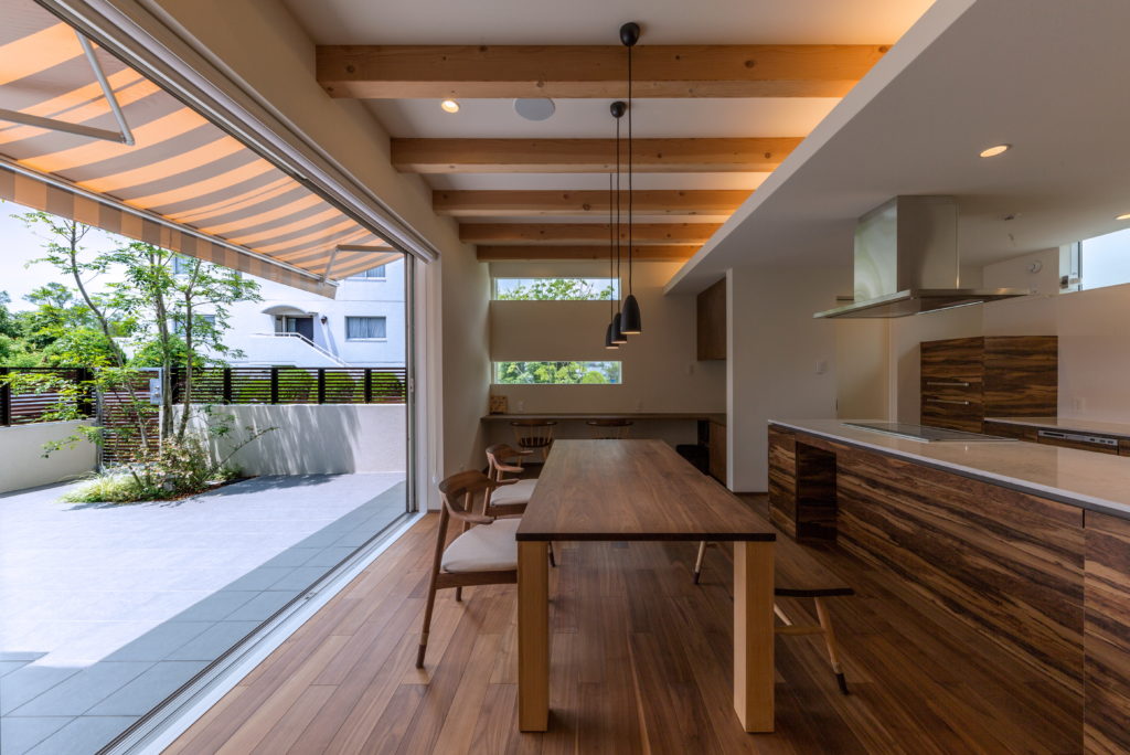 ダイニングとコートにかけての間は床をほぼフラットに設計することで、室内外の一体感が生まれ、開放感が 強調されます。ダイニングはあえて木の梁を出し天井を高くし、奥にあるキッチンは 天井を低くすることで、コートへの視線が自然と抜けていきます。