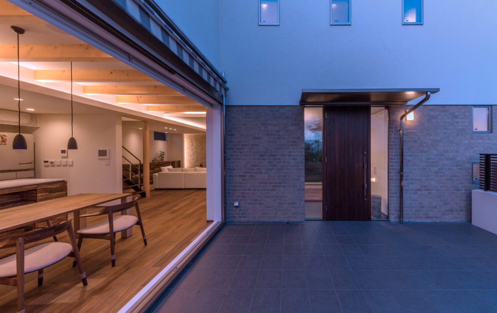 公道から少し上がった玄関に向かって階段を上がると、このコートがお出迎え。道路とは高低差があるため視線は遮られ、プライベート空間を確保することができました。 また、お友達を招いた際にはコートから 直接ダイニングに入れることもできます。