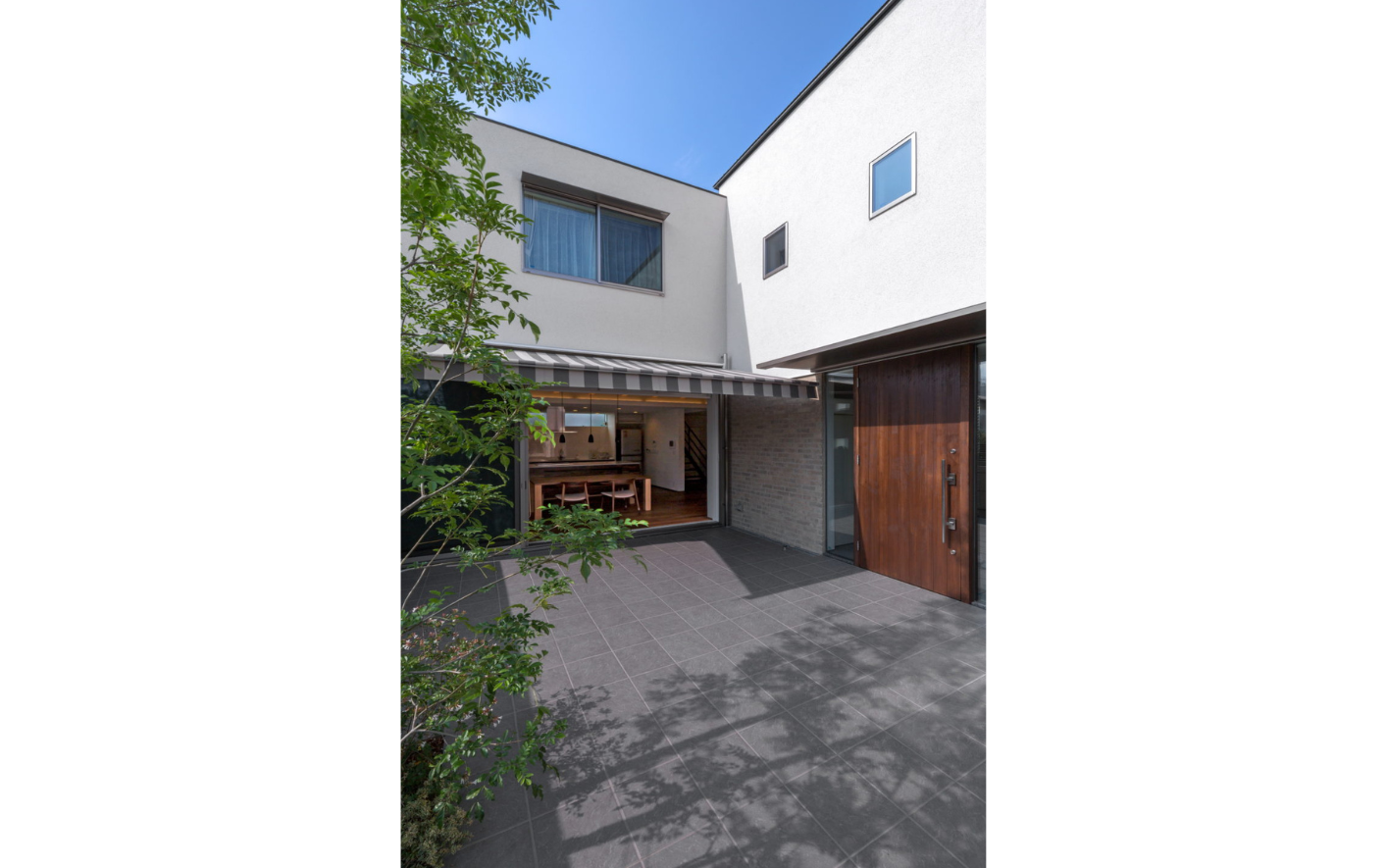 パタパタと優しく揺れるオーニングテント。リビング前に設けたオーニングテント付きのコート(中庭)は、玄関アプローチとしても機能します。