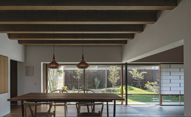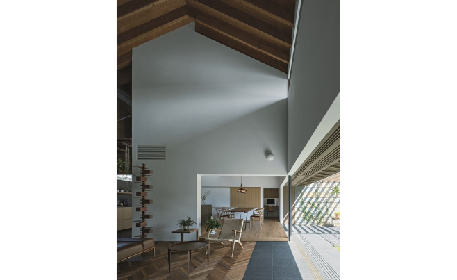リビングダイニングは、庭に面する幅7.3mの木製ガラス窓は高さ約1.9mに抑えて視線をコントロールしています。この横に広がる窓が33帖の室内と33帖の庭をつなげ、開放的な空間を実現。天井高約6.2mの伸びやかなリビングが避暑地にいるような気分をもたらしてくれます。