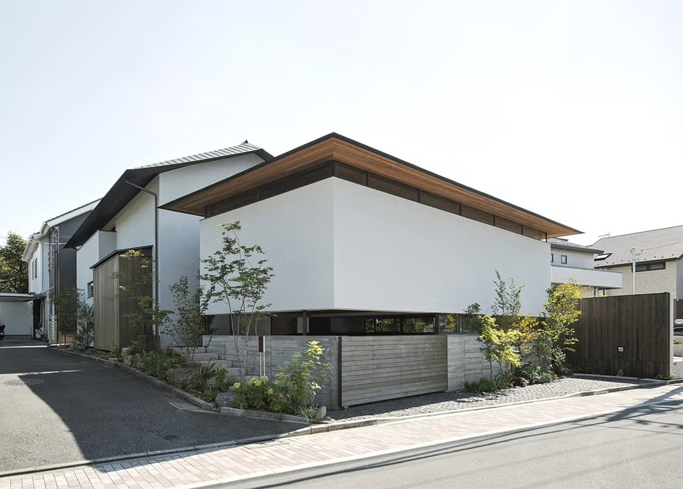 住まい棟とオフィスを兼ねた付属棟の2つの棟から構成。2棟に段差を設け、庭をコの字に囲むように配し、道路からのプライバシーを確保しています。また附属棟は地盤を掘り込み、高さを抑えて周囲の環境に配慮。