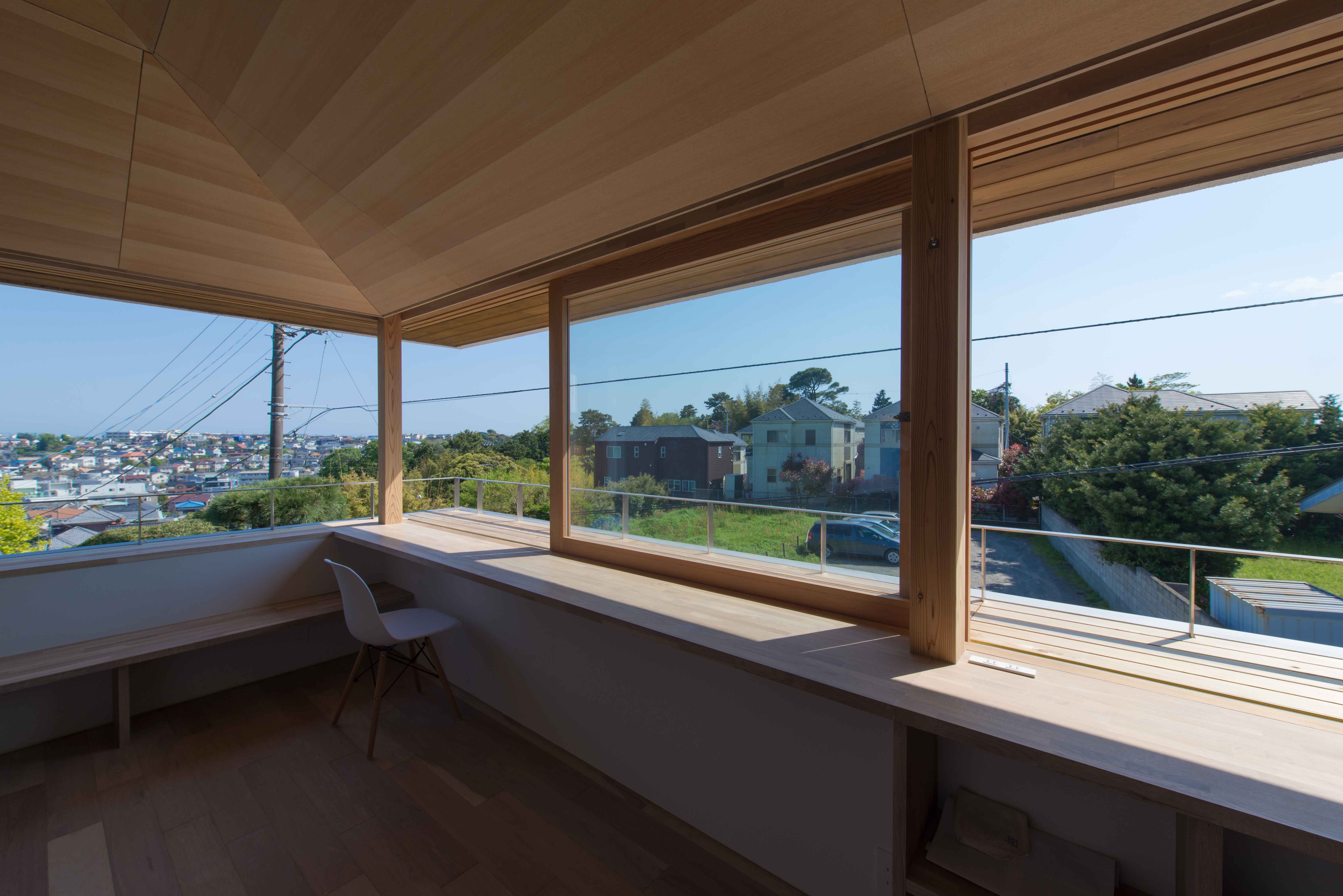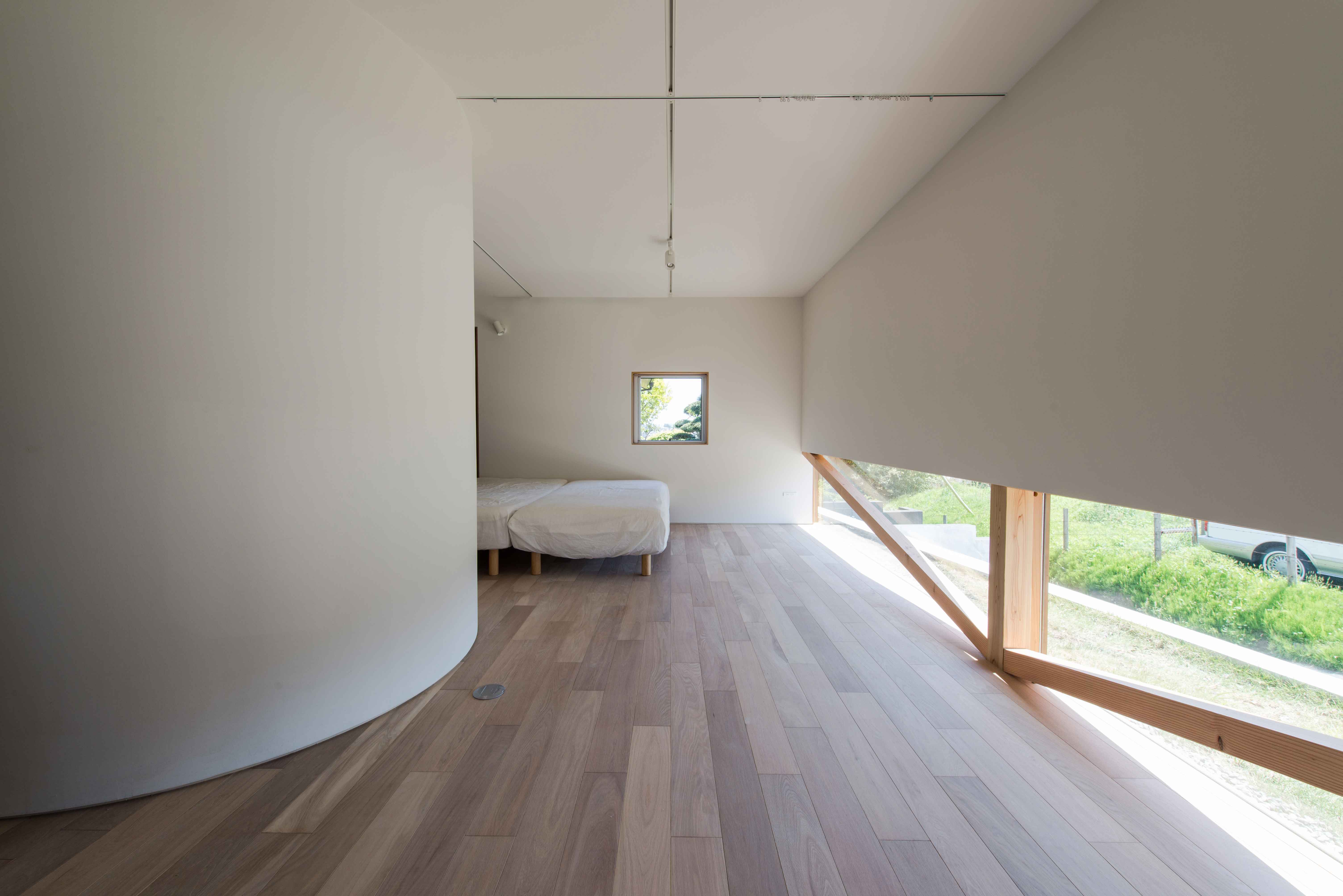 1階には寝室と水回りを配置。天井の高さを抑えて、地面と連続するように地窓を設け、外の緑を眺める落ち着いた空間に。2階は天窓とアール形状の丸い柱(階段室)の周りを囲うようにキッチン、ダイニング、リビングが並び、家族の気配を感じる一体感のある空間に。天井高くに配した天窓から光が注ぐ、開放的なリビングスペースには鎌倉の景色が広がります。