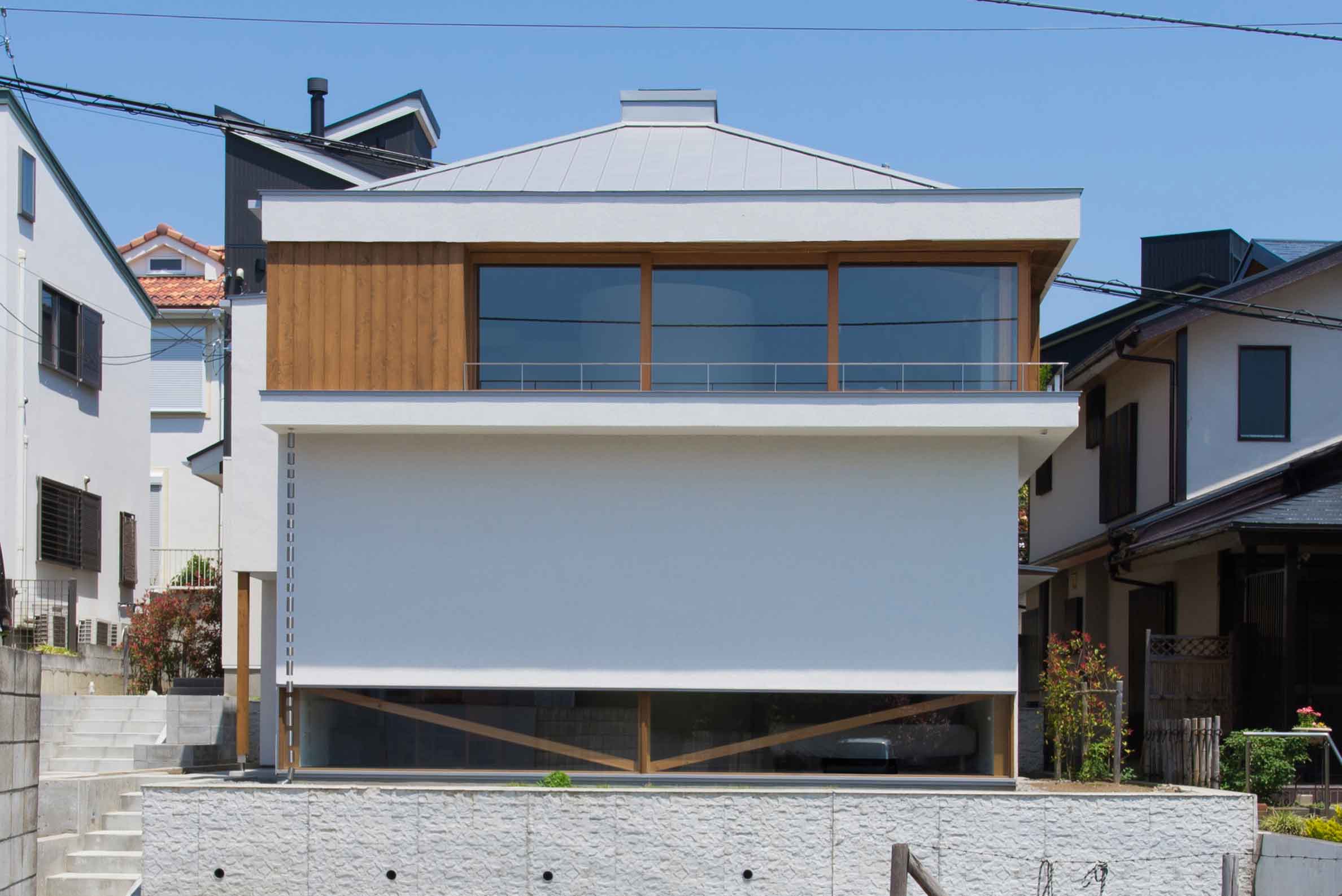 鎌倉の丘に立つこの住まいには、アール形状の丸い柱の階段室が中心にあります。