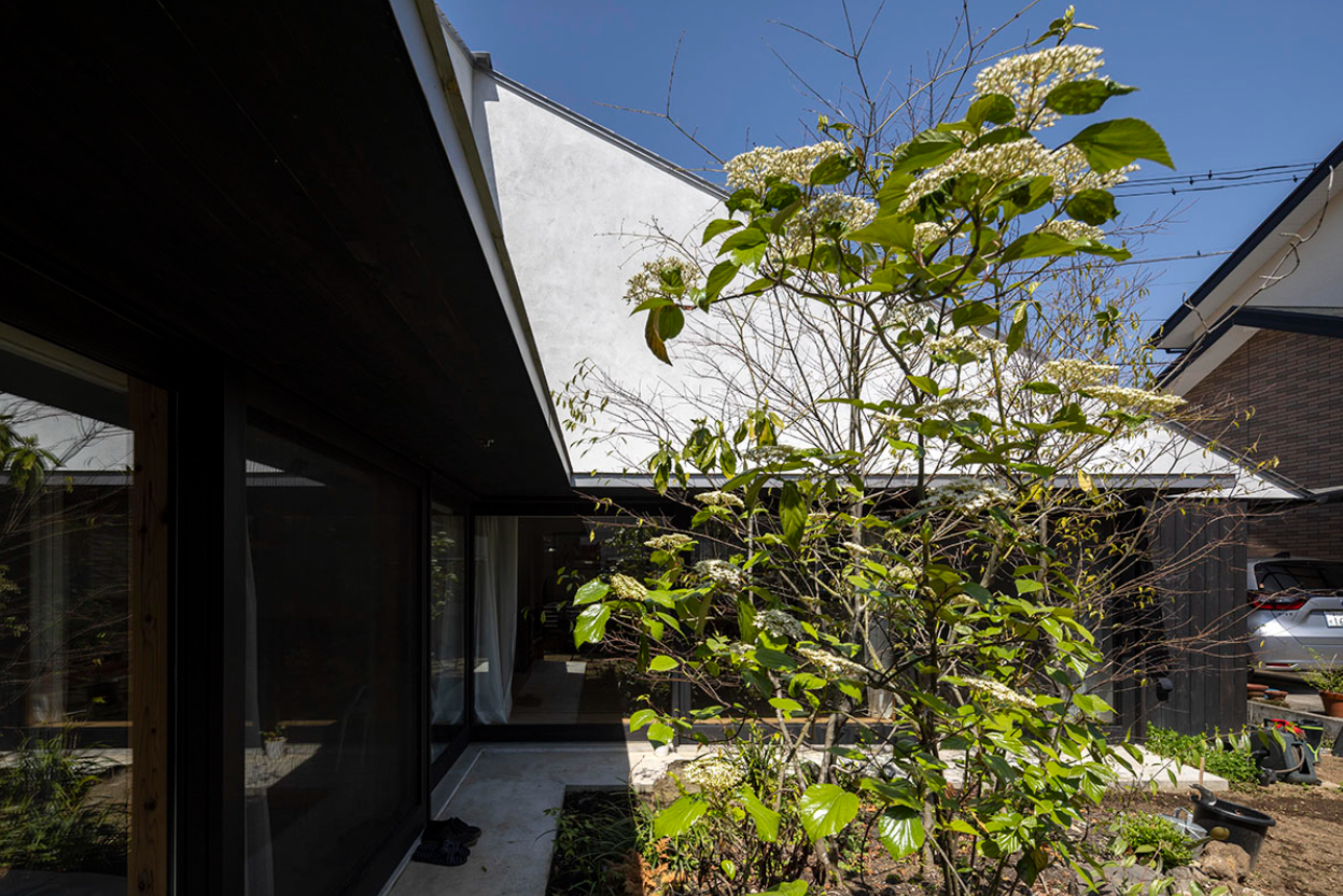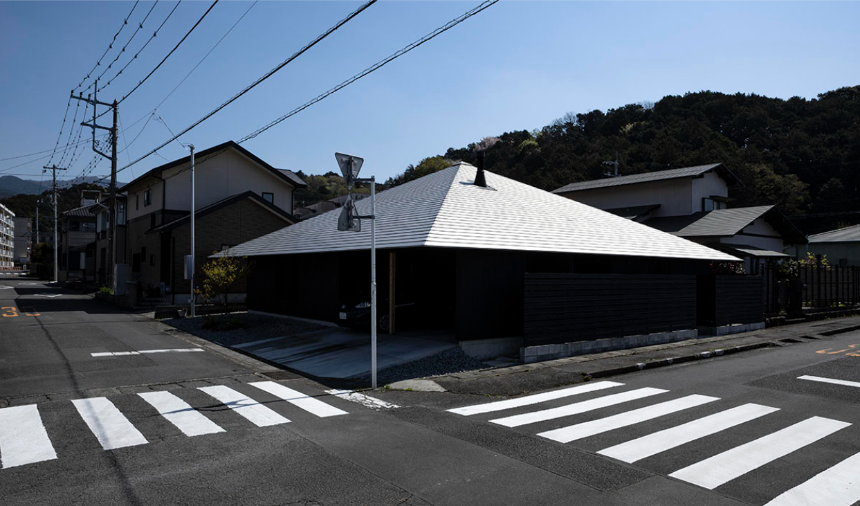 4面が中央に向かって結ばれたシンプルな形状の寄棟屋根は、その4分の1をカットし、南側に庭を配置。これにより、交差点に面した場所でもプライバシーを守りながら、落ち着いた雰囲気のある庭となりました。