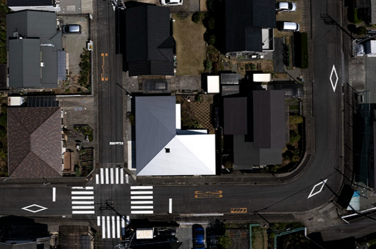 もともとこの場所には3階建ての大きな建物が建っており、周囲に影を落とし、威圧感を感じる角地でした。この場所に住まいを構えるにあたり、全体の高さを抑えた設計で、周囲に調和し、柔らかく馴染む住まいになるよう心掛けました。こうすることで、周辺の住宅にも日差しが届き、交差点の見通しもよくなり、街の景観にも変化が生まれました。