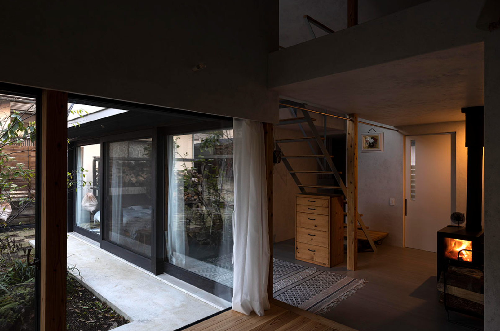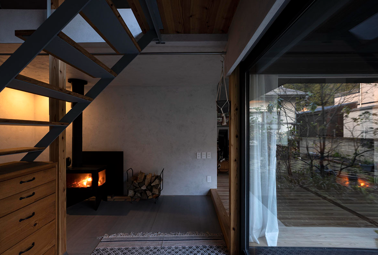 光と影、そして火が持つ自然な温もりを活かし、現代的な感覚や要素を感じながらも、どこか懐かしく心地よい空間となっています。
