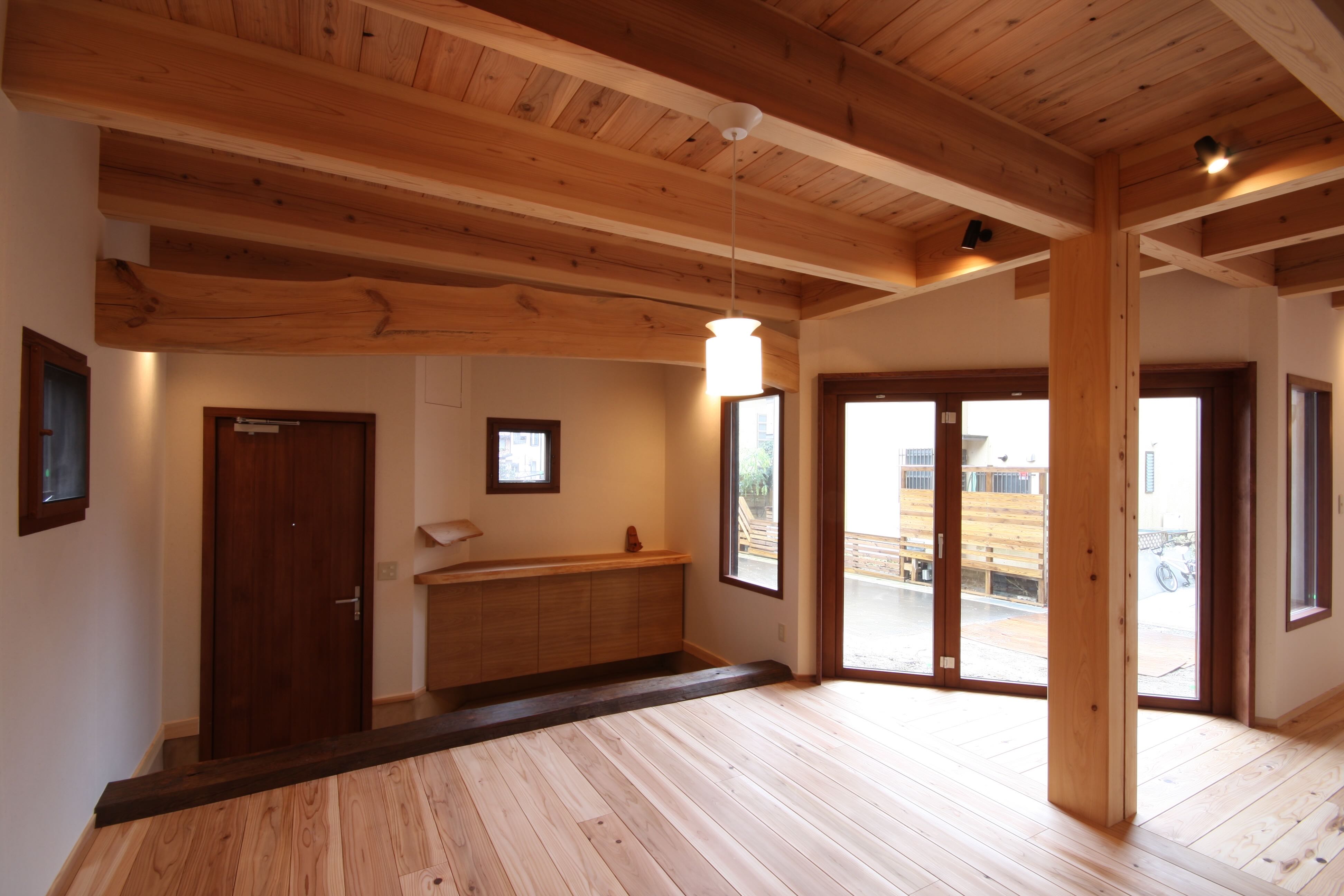 「縁側でざるそばを食べてみたい」というご夫婦の要望に応えて、南側を向く外部空間に縁側を配置。家族のイメージに合わせて、古民家に使われていた梁や頼もしい八寸の大黒柱、墨色の土壁など、自然の素材を採用しました。