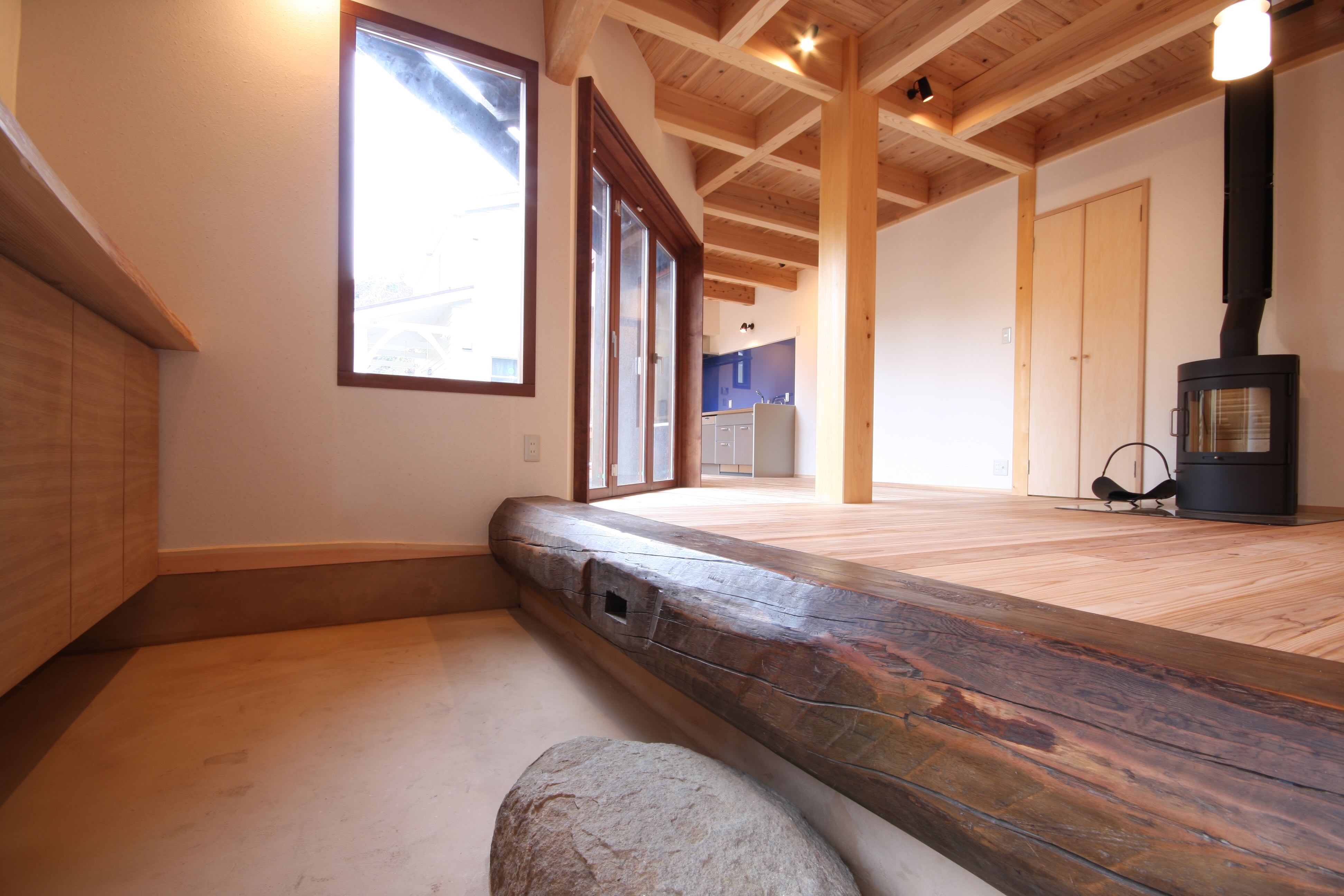家の中央に配置された大黒柱が、それぞれの空間にほどよい距離感を与えます。薪ストーブの煙突は、1階から2階へと真っ直ぐ立ち上げ、余熱を有効利用してます。玄関のあがり框には、古民家に使われていた古材を取り入れたことで、空間に深みをもたらします。