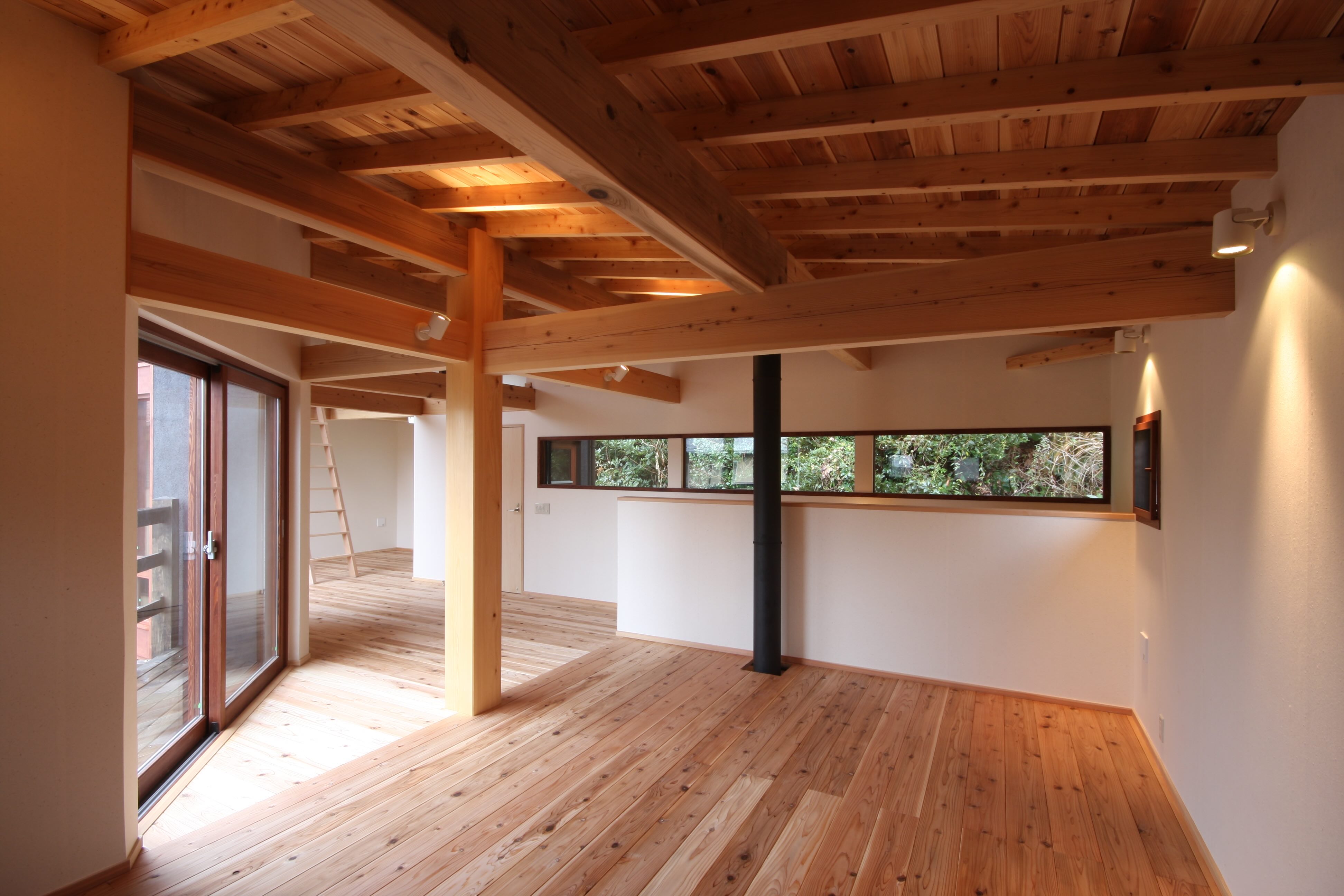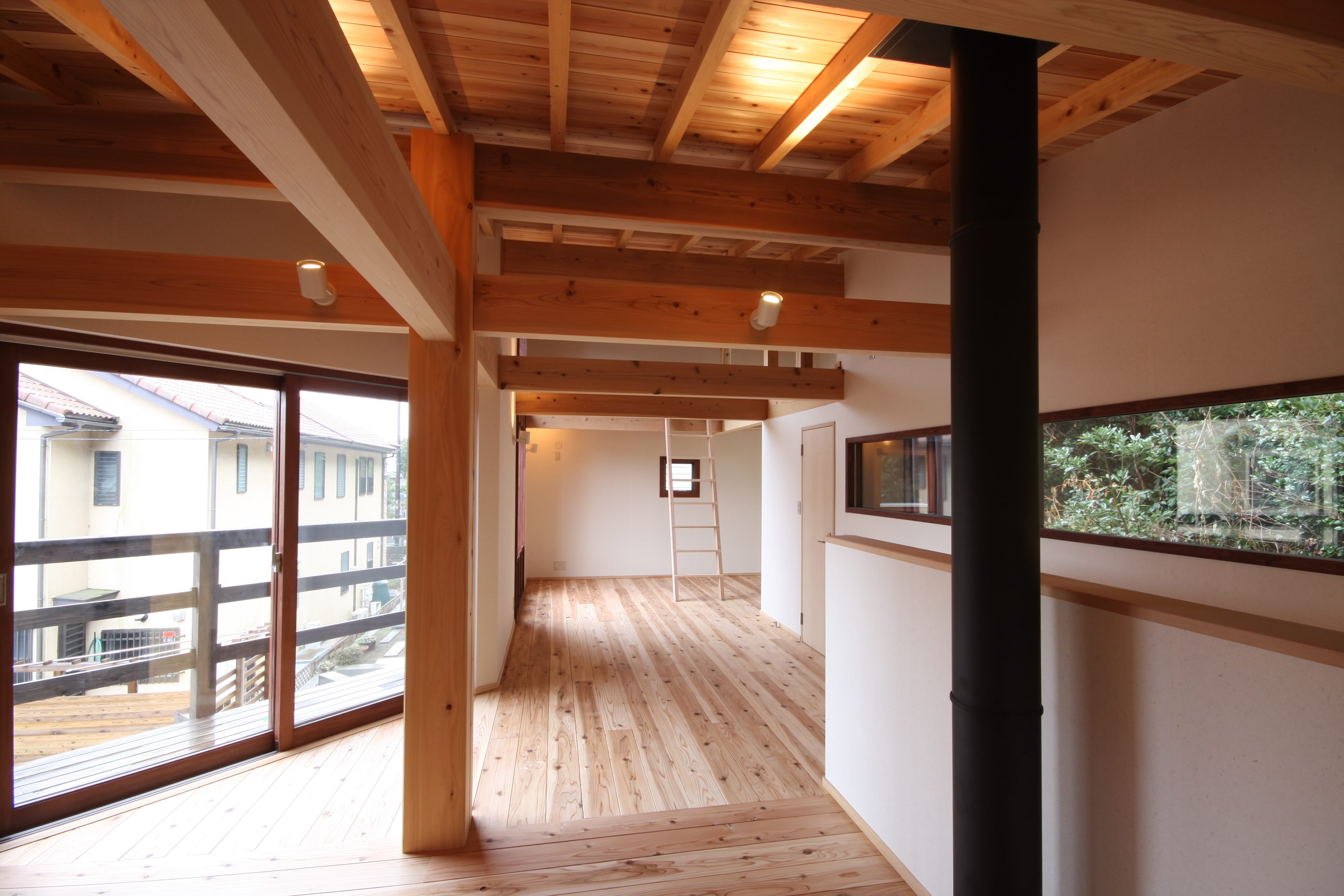 子供たちが自由に過ごす2階のスペースには、横長に窓を切り出した窓から背面に広がる自然の景色を眺めることができます。