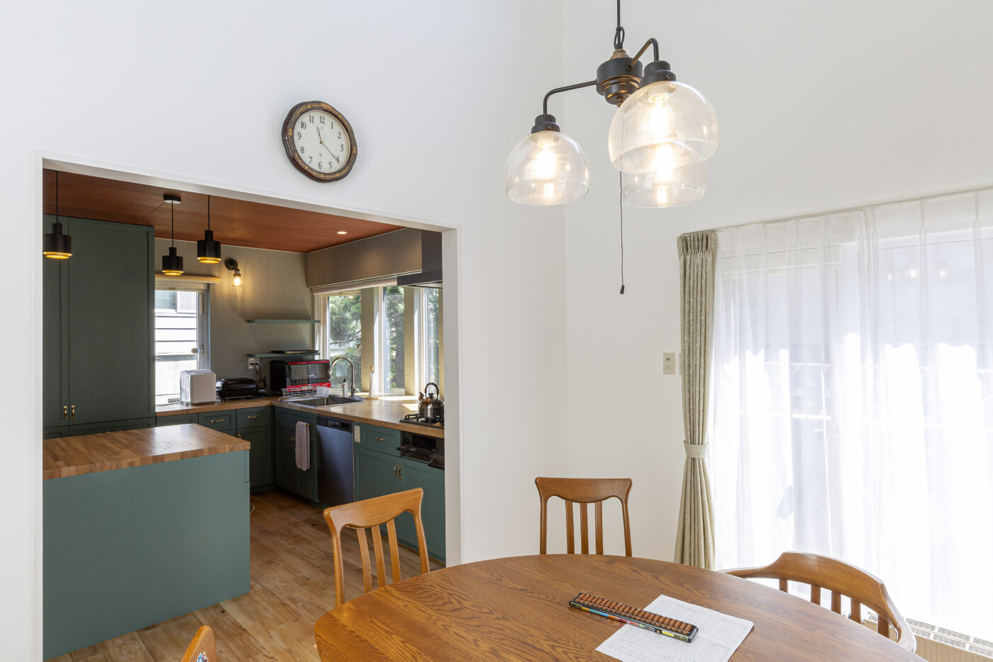 以前のキッチンは奥まった暗い場所にあり、さほど広くもありませんでした。リビングからも離れており、見通しがきかないことが問題でした。そこでリビングに隣り合うダイニングへキッチンを移し、旧キッチンの半分をパントリーにすることで、大きくすっきしとしたキッチンに仕上げました。