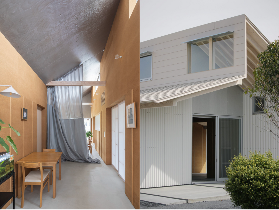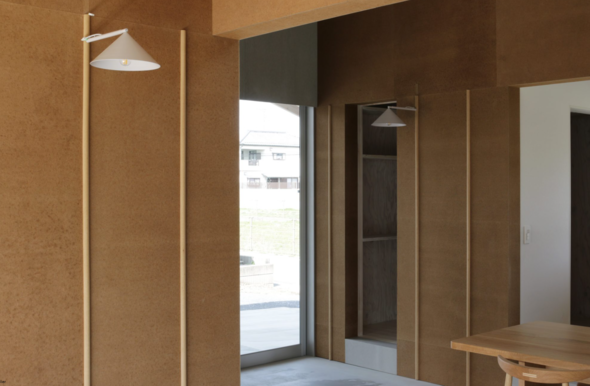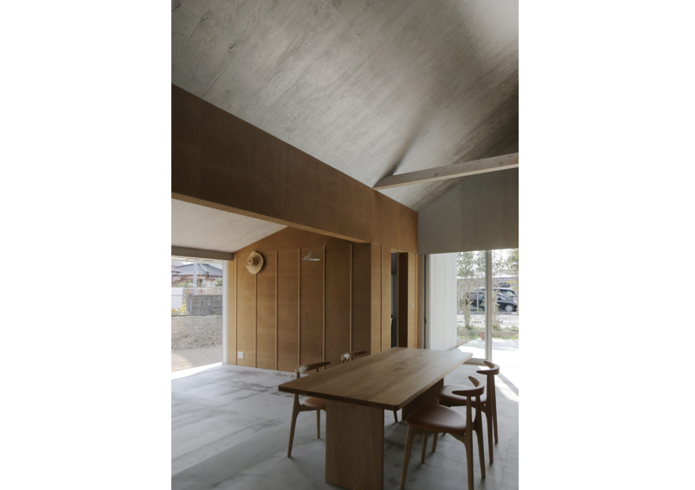 住まいの中心にリビングを設けると光が入りにくく、暗くなりがちです。リビングの中心に安定した柔らかな光を取り入れるため、屋根の素材と色から考えました。軒上を含む屋根をクリーム色のガルバリウム鋼板にすることで、この家の象徴となる大きな屋根を鋼製しながら、空の光を受け止め、高窓から室内へ拡散光を取り入れます。そして、室内のシルバーに塗装した天井がレフ板の役割となり、リビングを柔らかく照らします。室内は最低限の照明でも十分です。