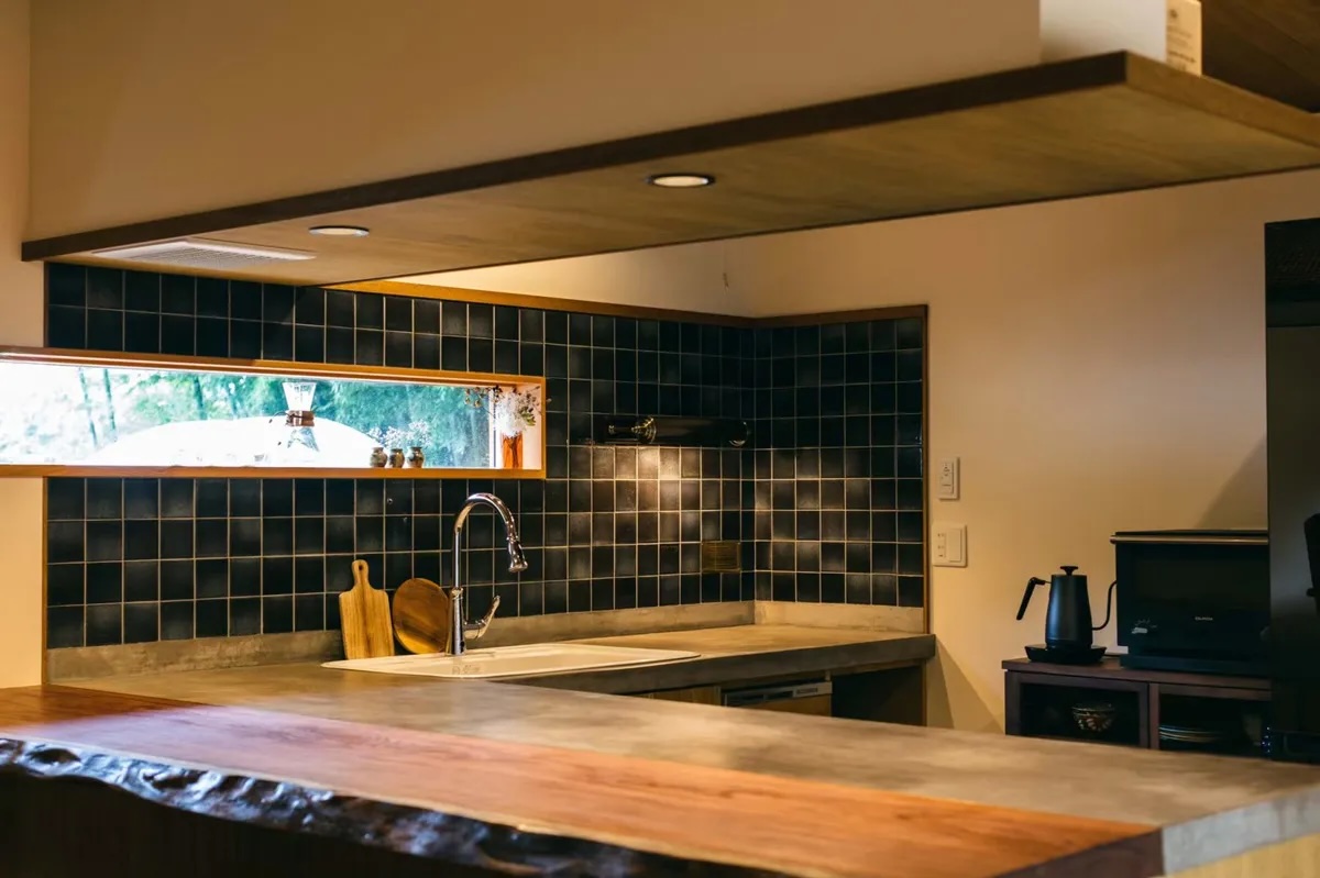 住まいの中は、デメリットになりがちな敷地の高低差を活かすようにして計画。キッチンからリビングを小上がりで仕切りました。そうすることで、段差部分に腰ををかけ座ることができるキッチンカウンターが誕生。またキッチンから横長に配置した窓から外の緑を楽しめます。