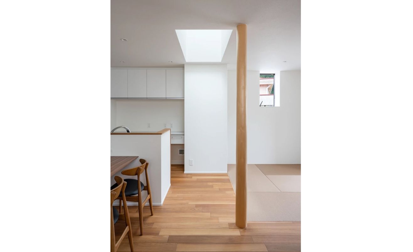 また2階を大きめに採ることで、広々としたLDKが生まれ、1階を2階より少し小さくすることで、外に駐車できるスペースを確保。角地の周囲の視線を遮りながらも、光を取り込むために窓を計画的に配置しました。リビングスペースに設置した天窓からは、心地よい光が降り注ぎます。