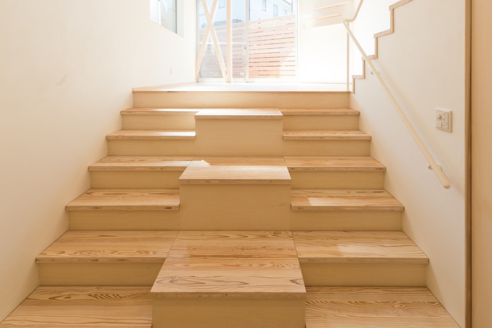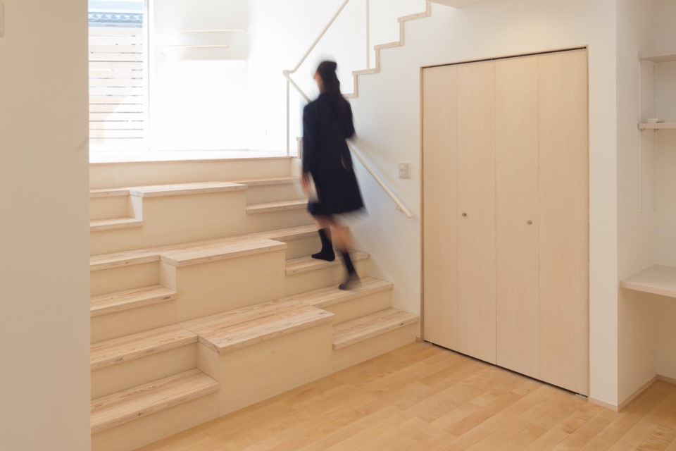 1階をリビングにするために段差をフラットにしようとすると、外から室内を見下ろすかたちで丸見えの状態になるため、土地の段差を活かした収納階段を設置しました。下から上まで、全てが収納になっています。
