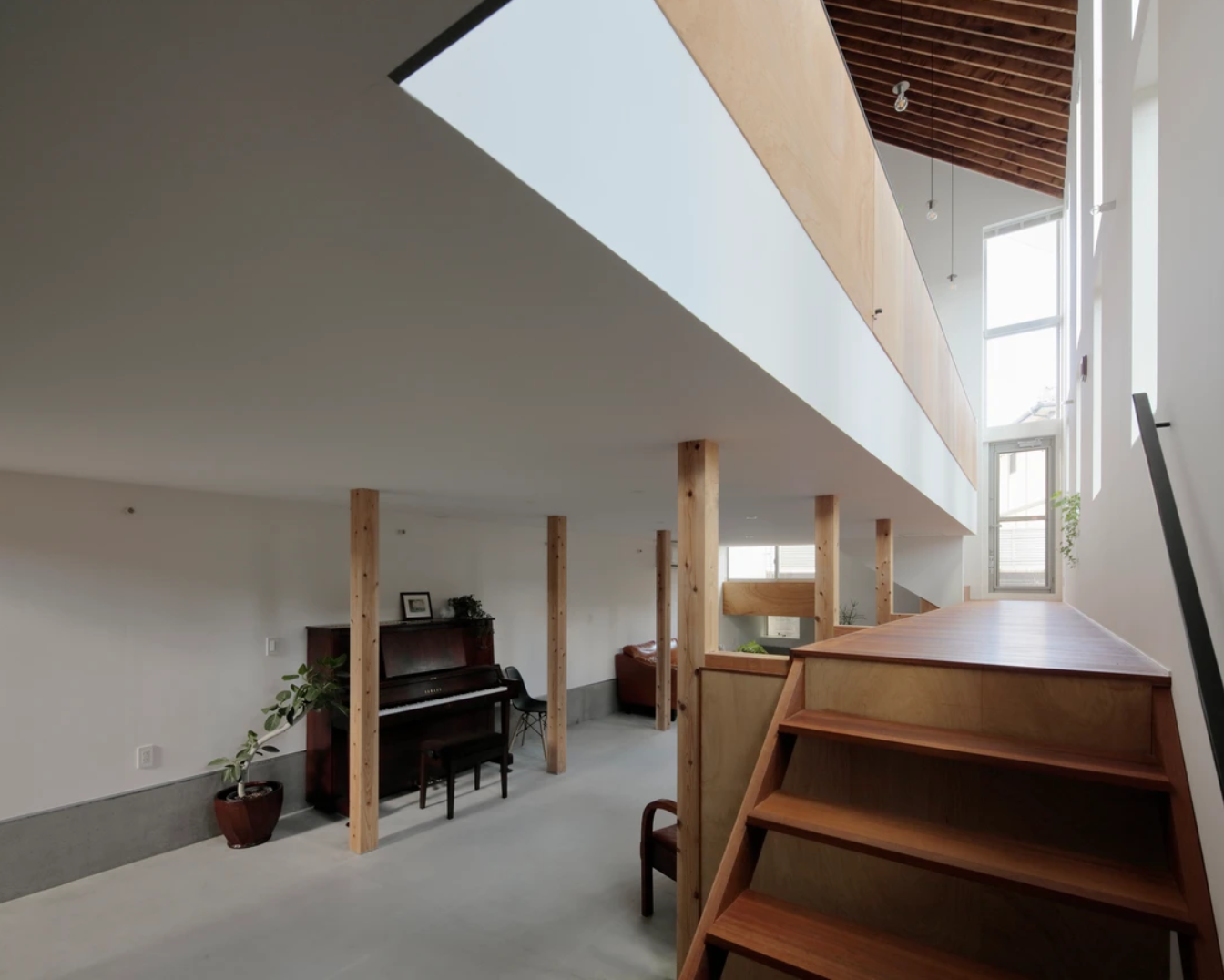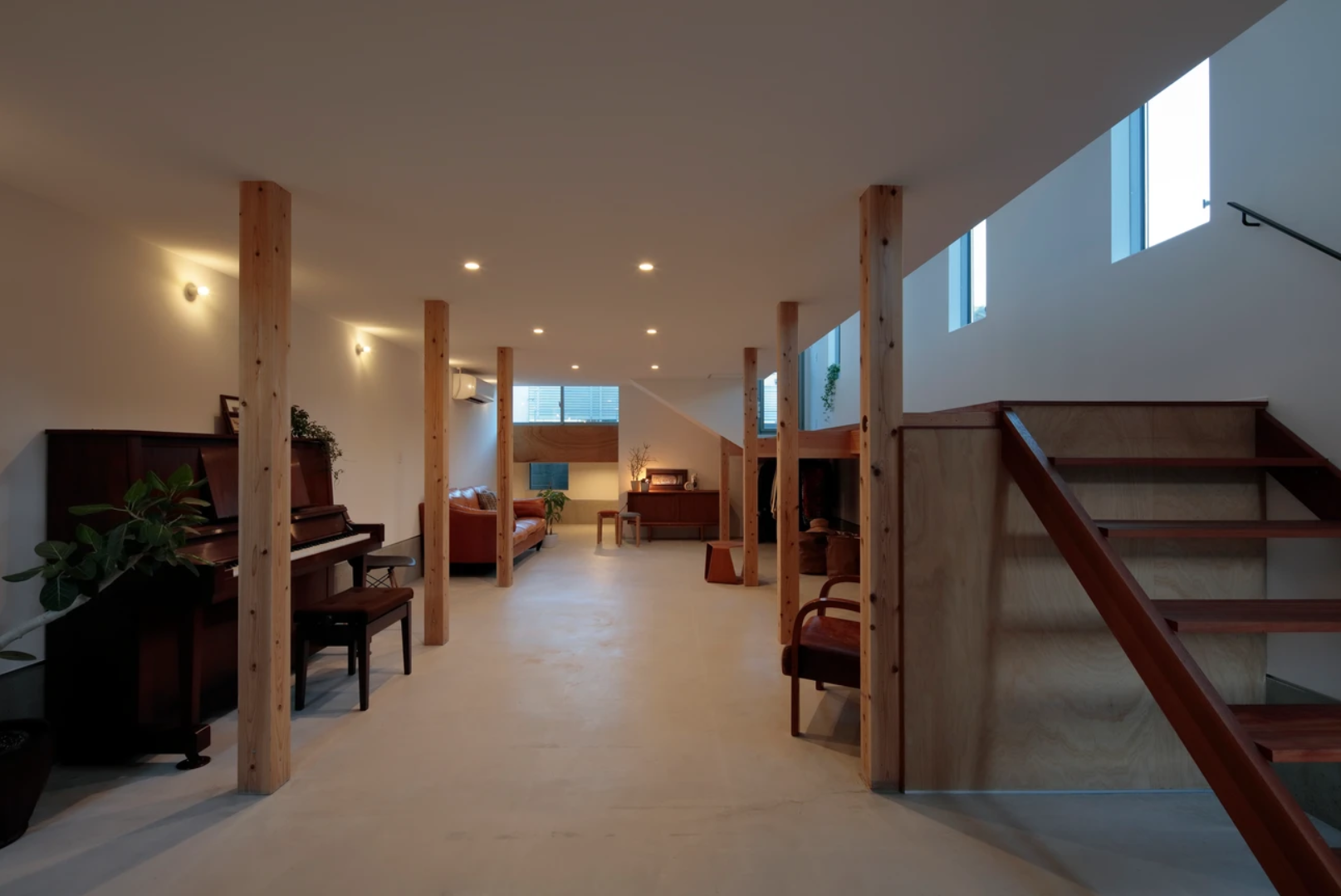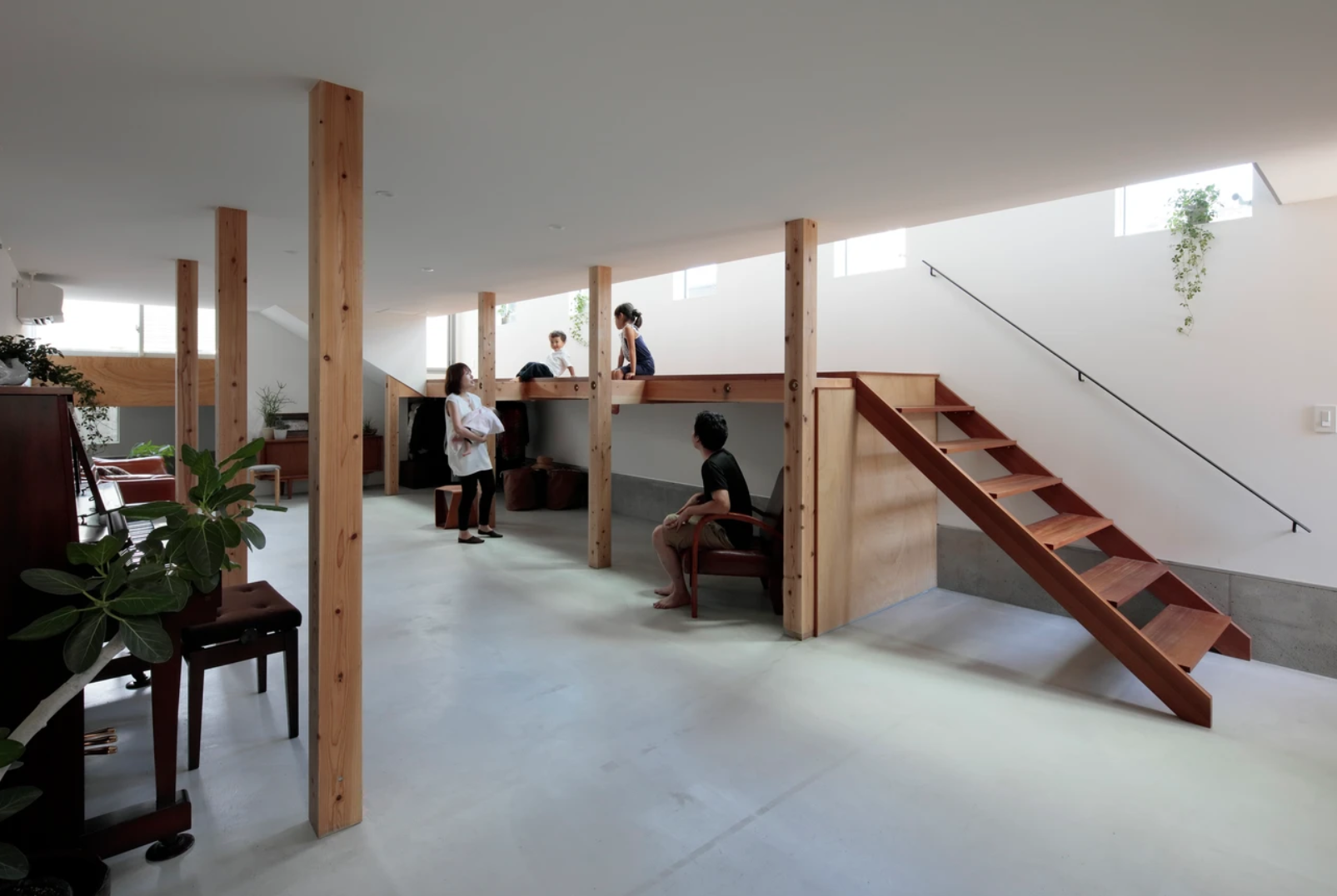 両隣が2メートルの塀で囲まれた敷地のため、1階は光を取り込めず暗いことから、1階をすべて土間にしました。小さなお子様がいるご家庭なので、今はピアノを弾いたり、元気に走り回り自由に使えるスペースになっています。