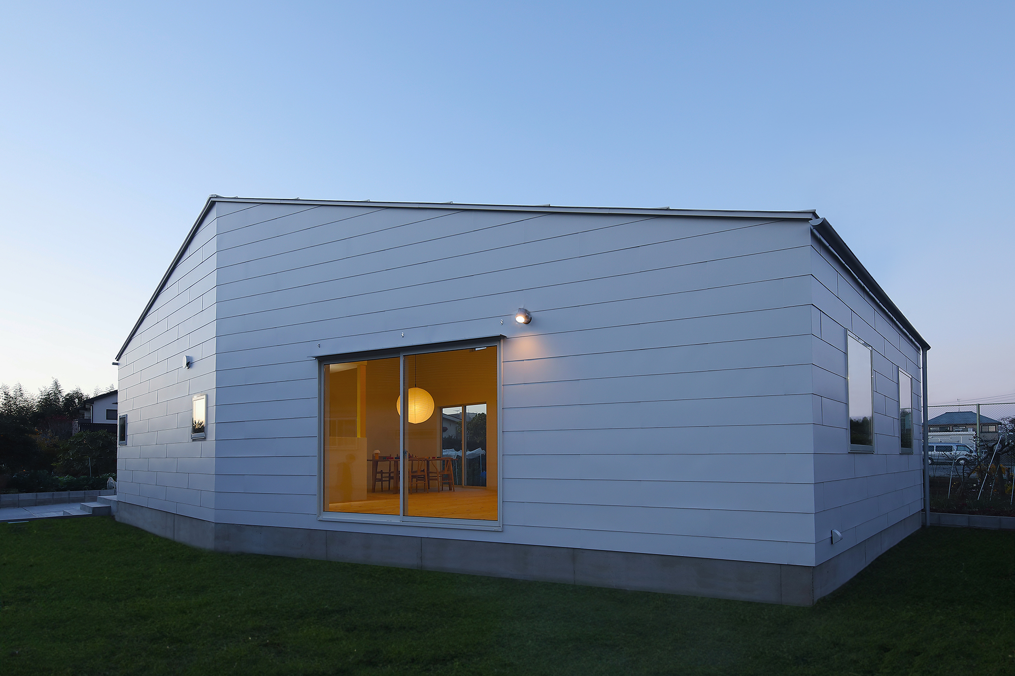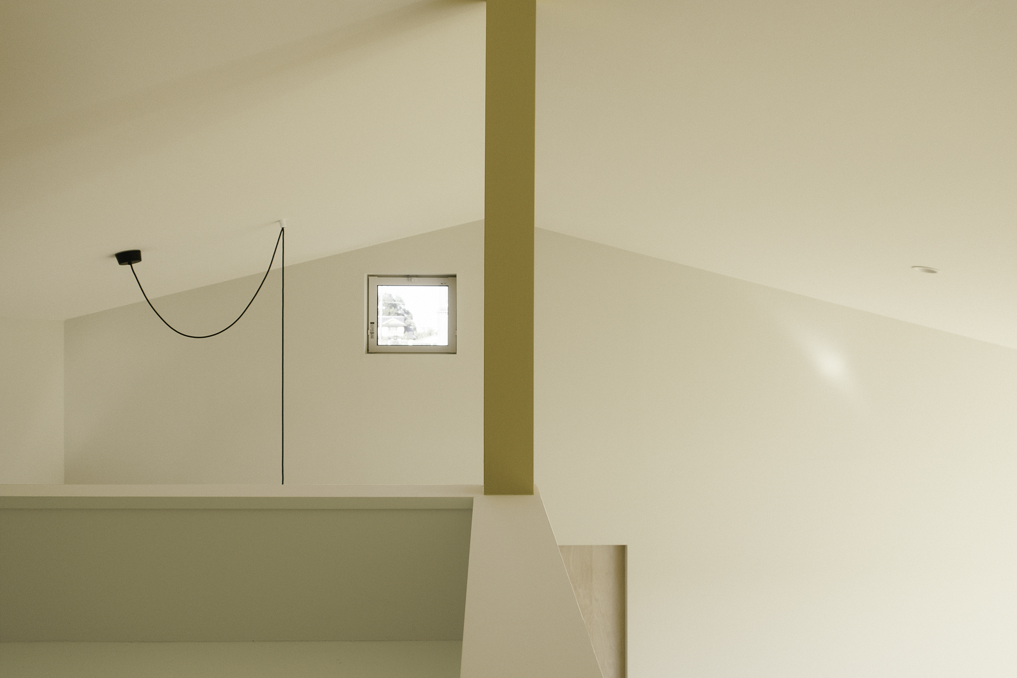 緩やかに傾斜した屋根は視覚的な効果をもたらします。屋根の中央は最も高い4.5メートルの高さを持ち、全体的に広さを感じさせるデザインが施されています。玄関の天井高は2.4メートルと低めに設定。高低差をつけることでLDKがより開放的な印象に。