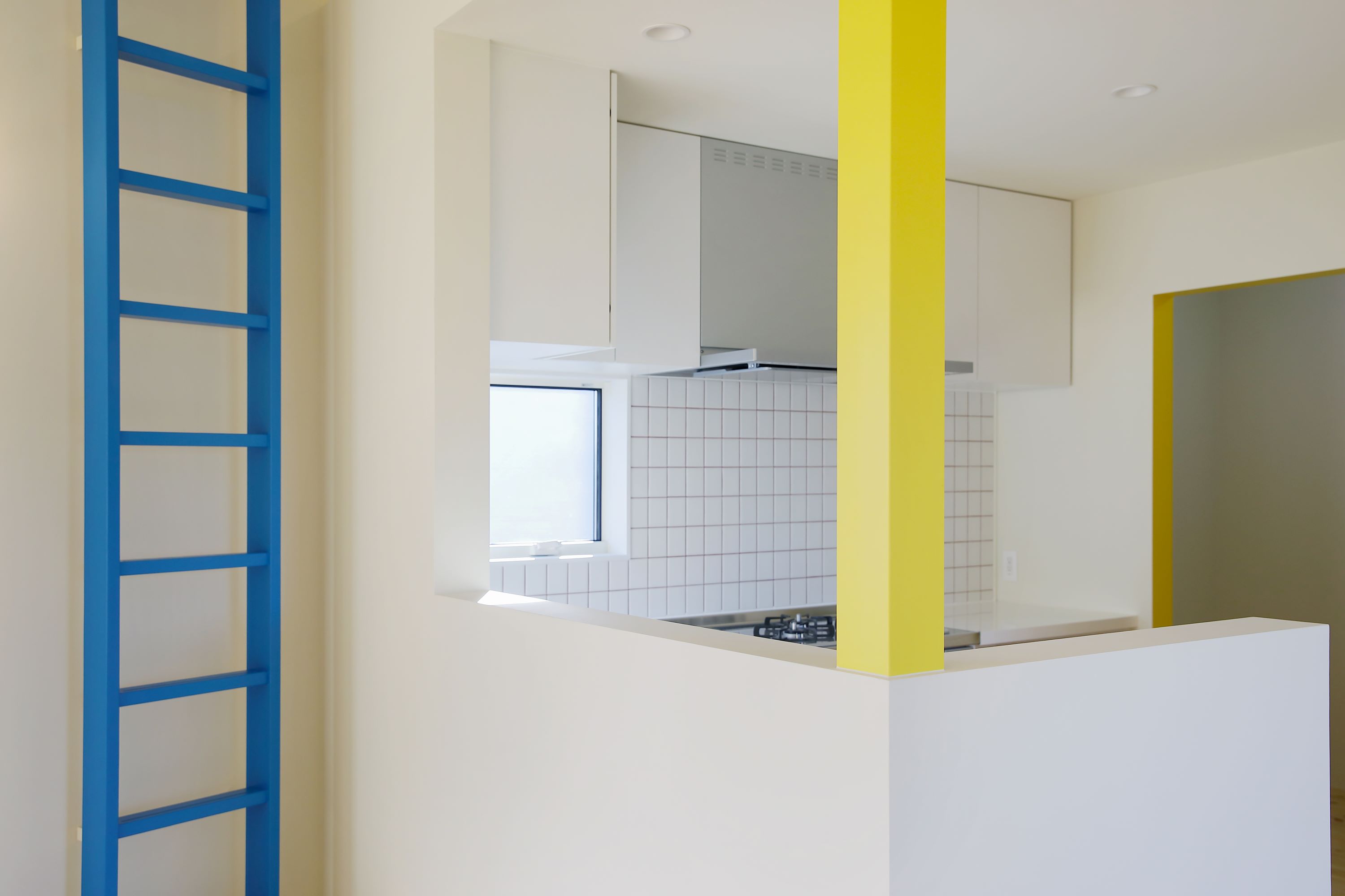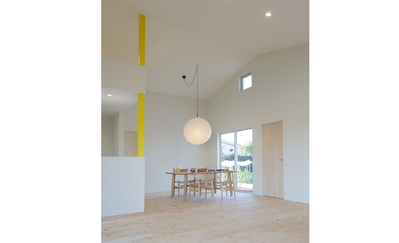 青の梯子や黄色の柱など、家の中に遊び心をプラス。そうすることでインテリアのヒントを与える役割も。床材には無垢材を使用し、木の温もりを感じながら、年月を重ねることで味わい深くなっていくその風合いを楽しめます。