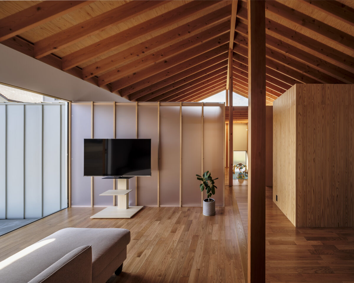 そこで南側の壁の天井部に三角窓を設け、室内の壁は天井まで作らず、ボックス型の部屋を置くように設計することで、天井部に光の通り道ができ、隣家の目線を避けながら、南側からの光を住まい全体に届けます。