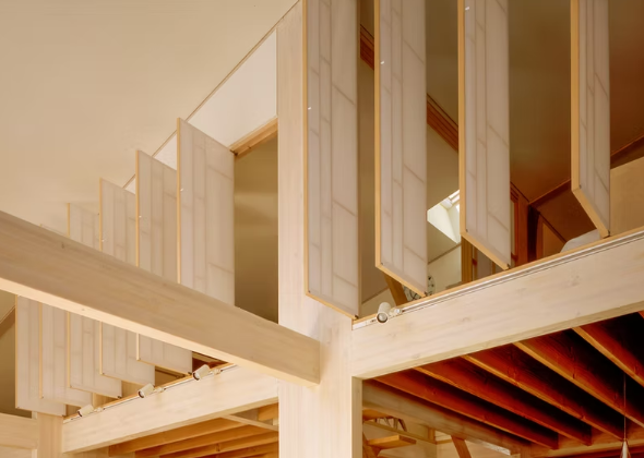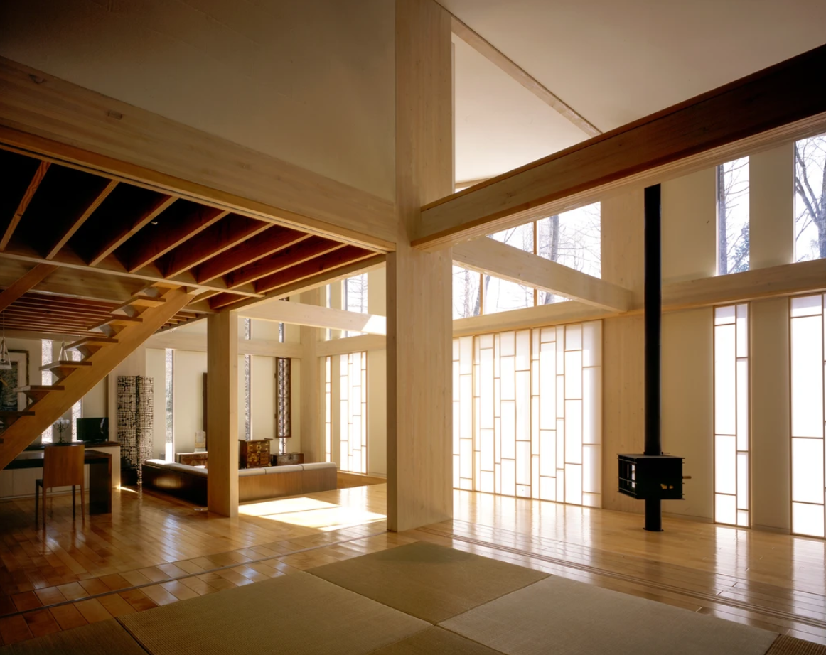 夜間の断熱効果を高めるために設けた障子も、通常の四角いデザインではなくランダムに配置することで、自然と木が生える森を想起させるデザインです。