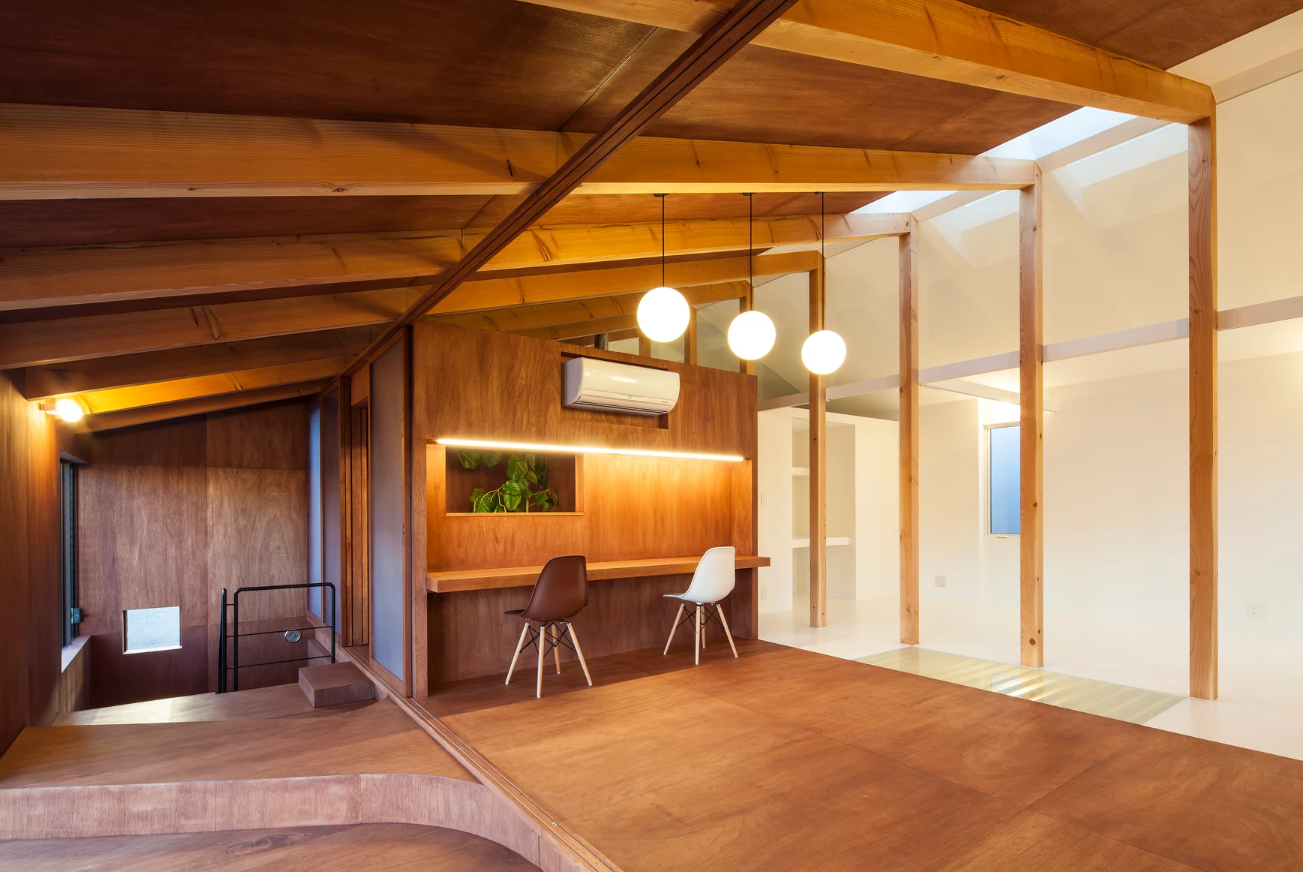 この住まいは、ひとつの空間に複数の要素を重ねることで、家族のライフスタイルに寄り添いながら柔軟に変化します。完全に仕切るのではなく、空間同士が緩やかにつながることで、それぞれの居場所を確保しつつ、広がりのある心地よい住環境を生み出しています。