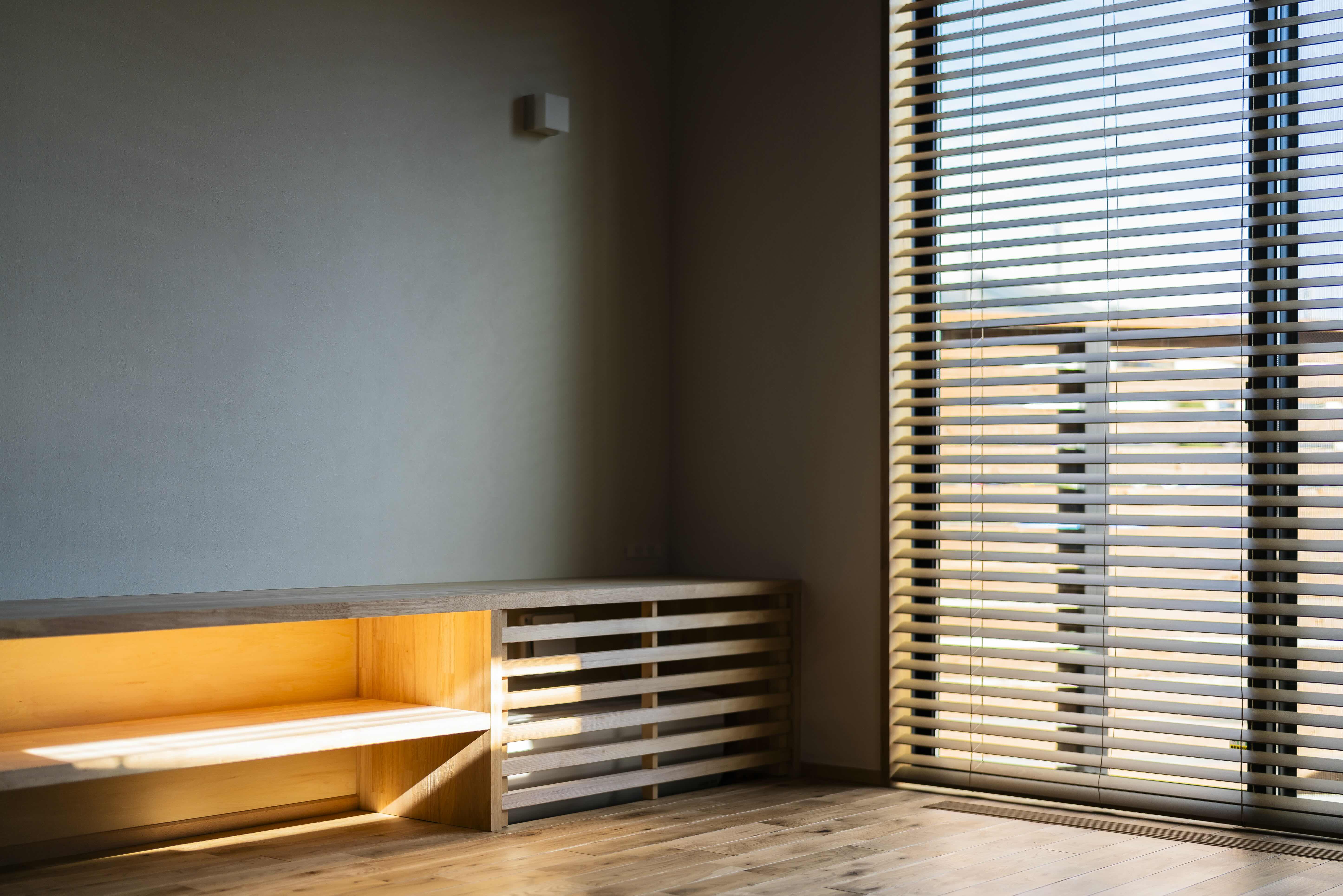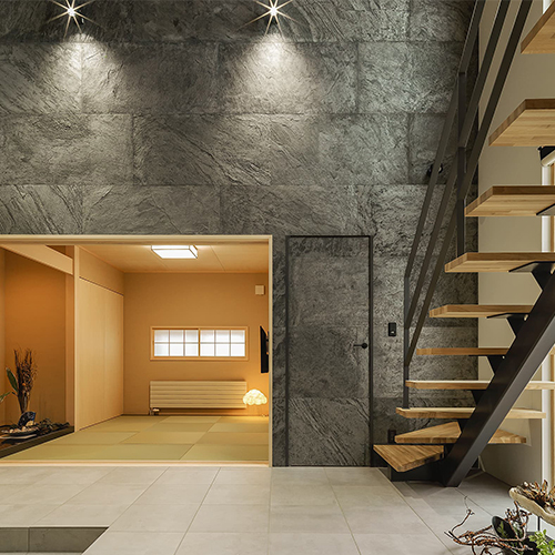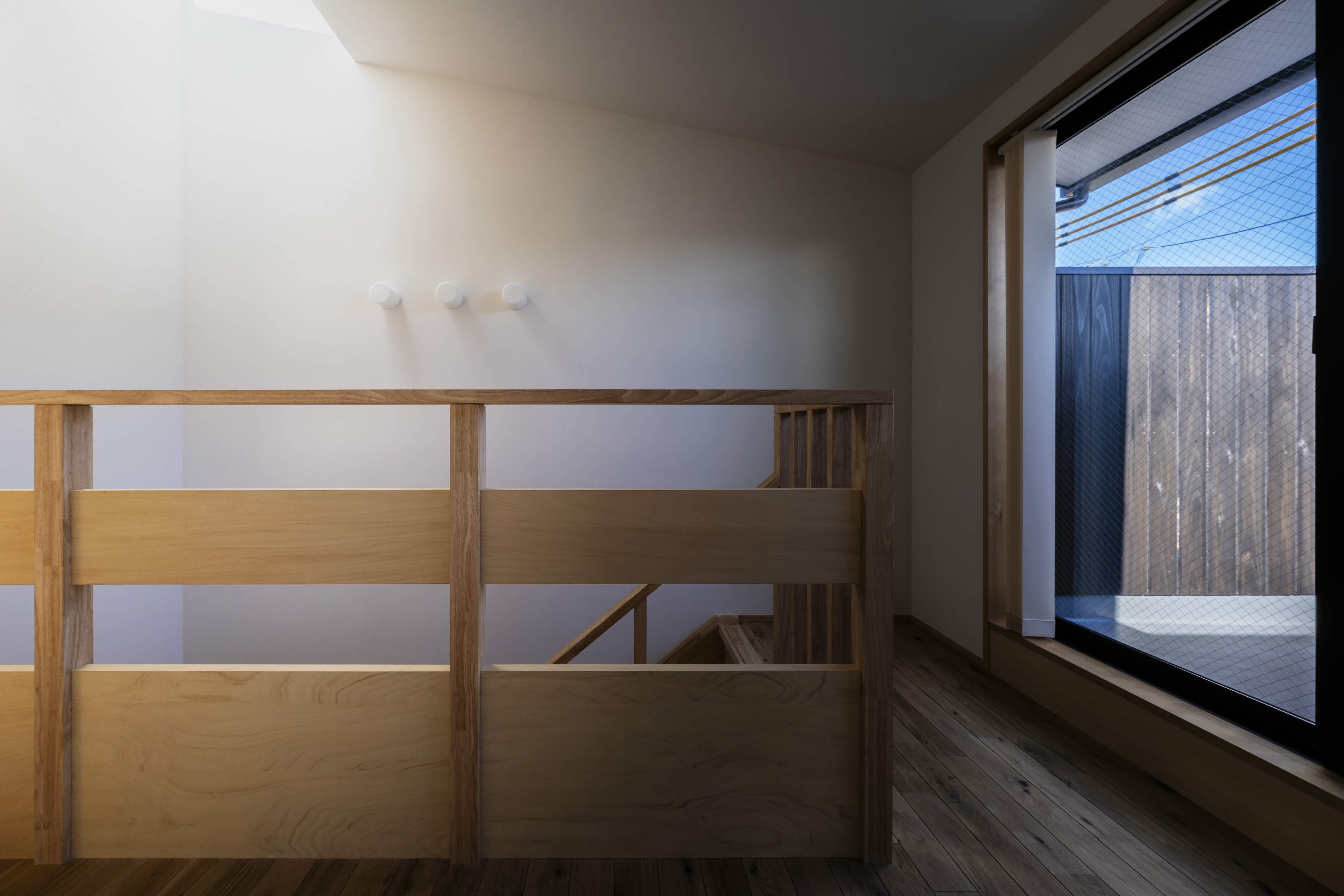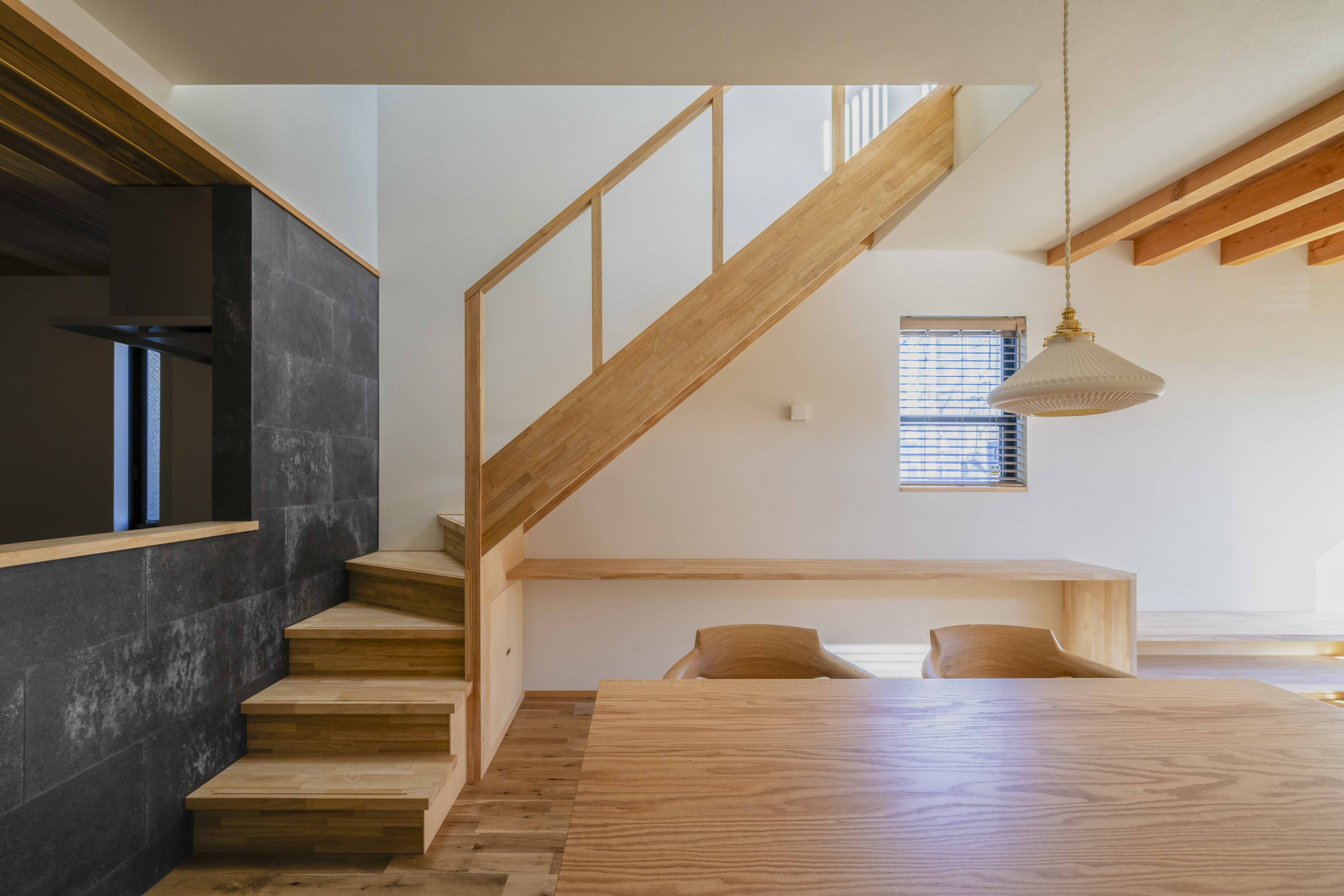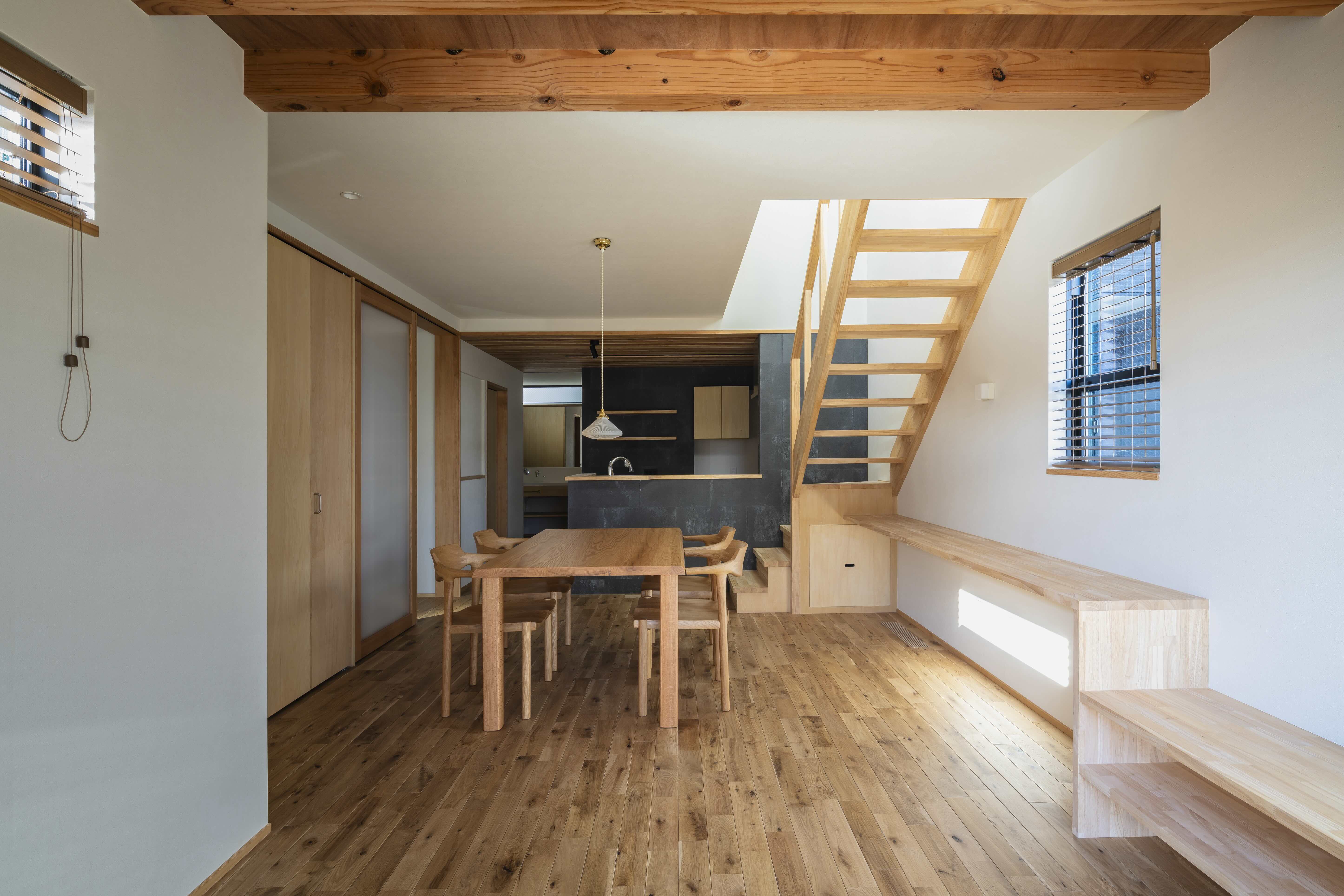 住宅密集地に佇む住まい。北側に配置されたLDKは、リビングの階段に小さな吹き抜けを設けることで、自然光を取り入れるとともに、床下エアコンの空調経路としても機能します。この設計により、心地よい温度環境が保たれながらも、開放的で居心地の良い空間を実現。