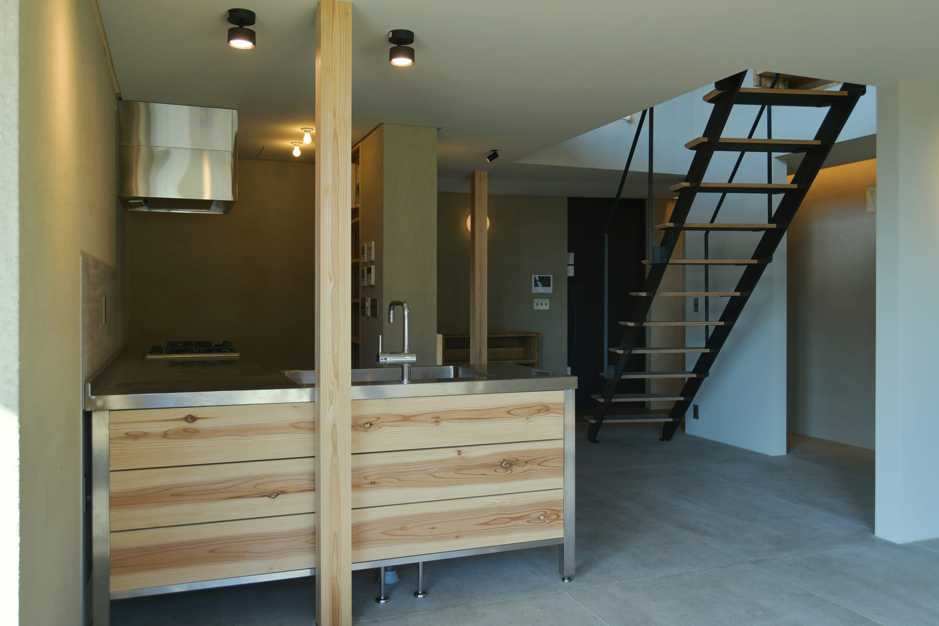 施主様は少し影のある落ち着いた雰囲気を希望されていたことから、壁や床、天井の仕上げはグレーを基調に主張しすぎないトーンでまとめ、暮らしの中で少しずつ色づいていく「余白」のある設計を目指しています。