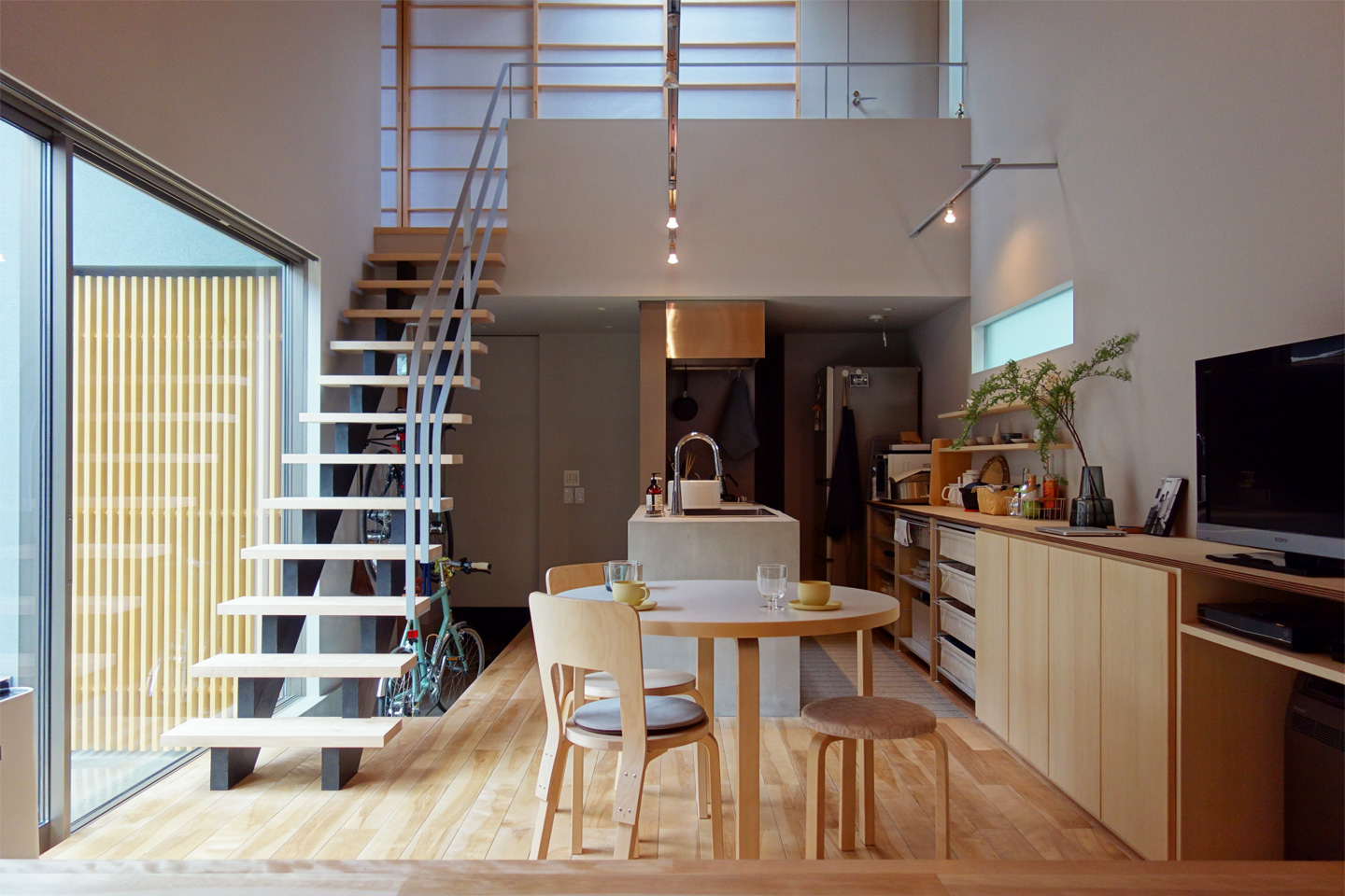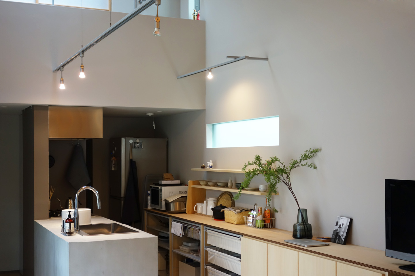 住まいの中心にはコンクリートのキッチンが据えられています。シンプルな塊として見せるため、極力凹凸をなくし、装飾を抑えたデザインに仕上げています。