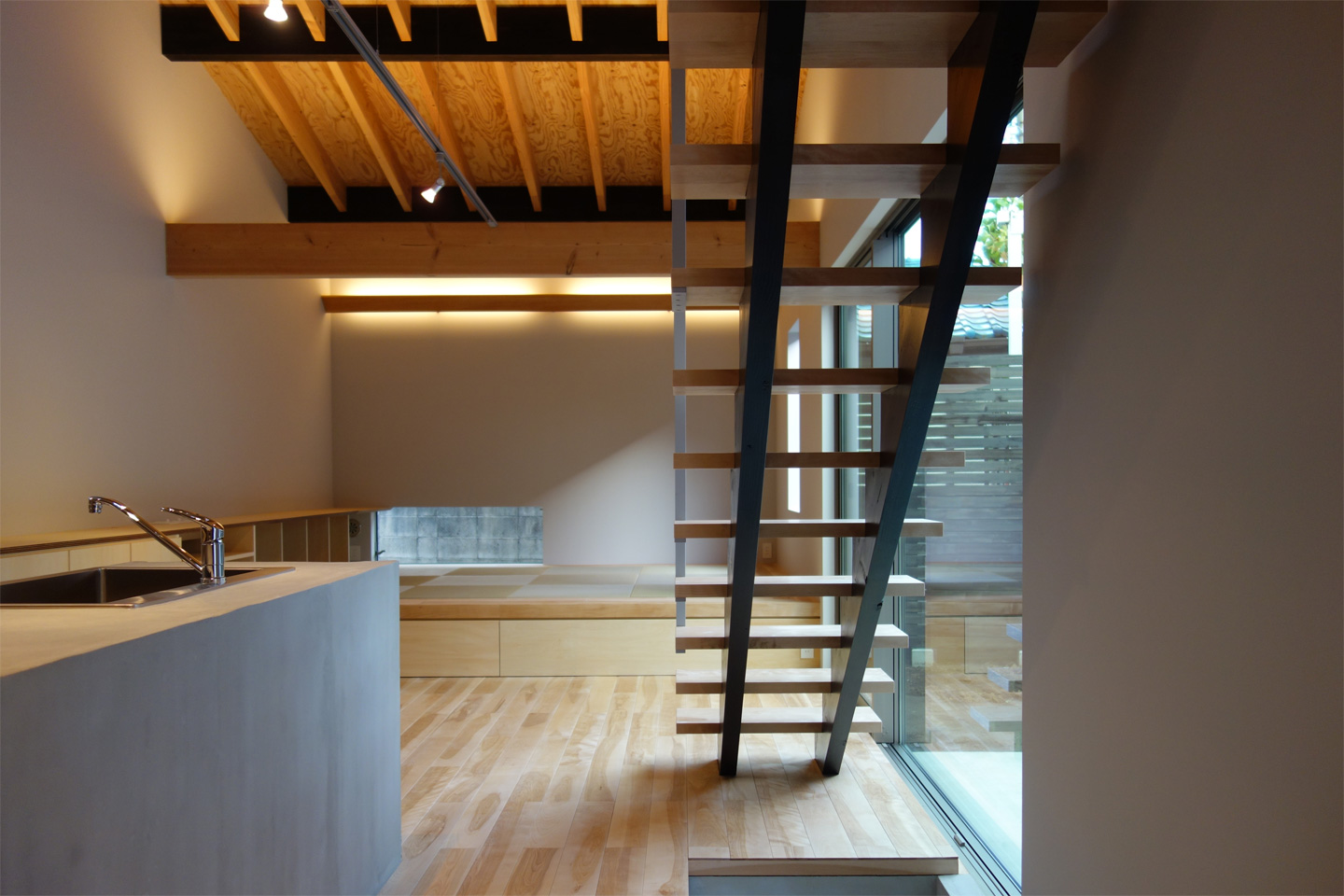 LDKの空間では木など自然素材を多用しています。木の軽やかさと温かみでキッチンを包み込むことで、コンクリートの無機質な質感との対比が生まれ、キッチンの重厚感が際立ちます。空間の「要」としての存在感を放ち、家族の拠り所となっています。