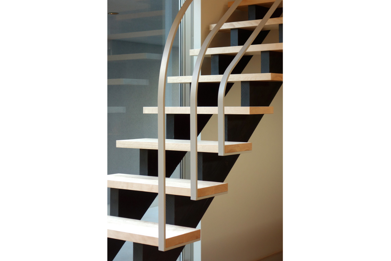 キッチン前の階段の手すりは、段板からそのまま伸びるデザインで造作しました。角を作らず丸みを持たせたデザインで空間の優しい雰囲気をさらに引き立てます。