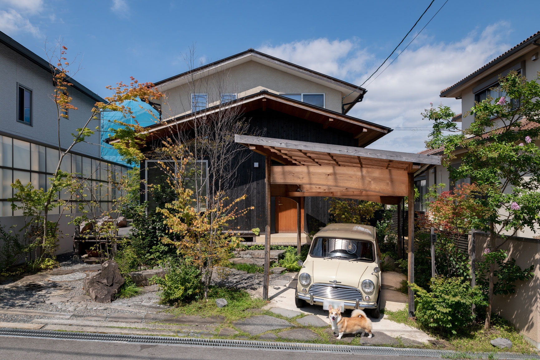 また、街並みに圧迫感を与えないよう、2階部分を道路からかなりセットバック。一見、平家のように見える外観とし、街並みに優しい、奥行き感のあるバランスのとれたファサードとしました。住宅街にありながら、自然と調和した美しい住まいが完成しました。