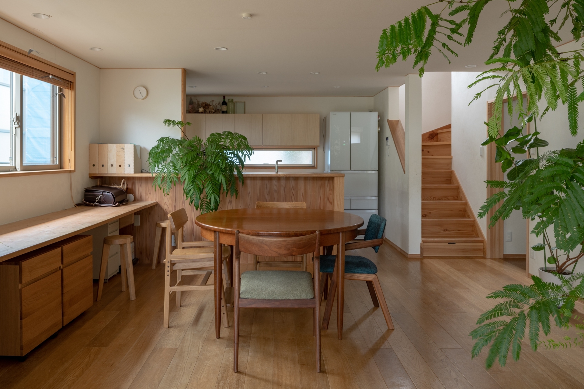 住まい手が造園家と数寄屋大工であるこの住宅は、庭と生活空間が近くに感じられることを考えて計画。内部からも美しい庭が見えるよう大きな開口部を配置。外からの目線を遮りつつも自然と調和した空間をつくりだしています。また、緩やかな階段で2階がアクセスしやすい場所となるように、階高を通常より抑えて設定。そのため、ダイニングは天井高2.1mと通常よりは低めの落ち着いた篭もりスペースに。対してリビングは最高3.3mの勾配天井とし、LDK全体で天井に動きをもたせ、変化のある空間としました。リビングに面した東側の上部三角形の窓からは朝日が差し込み、日々の生活の中で庭の美しさと共に心地よい光を感じることができます。