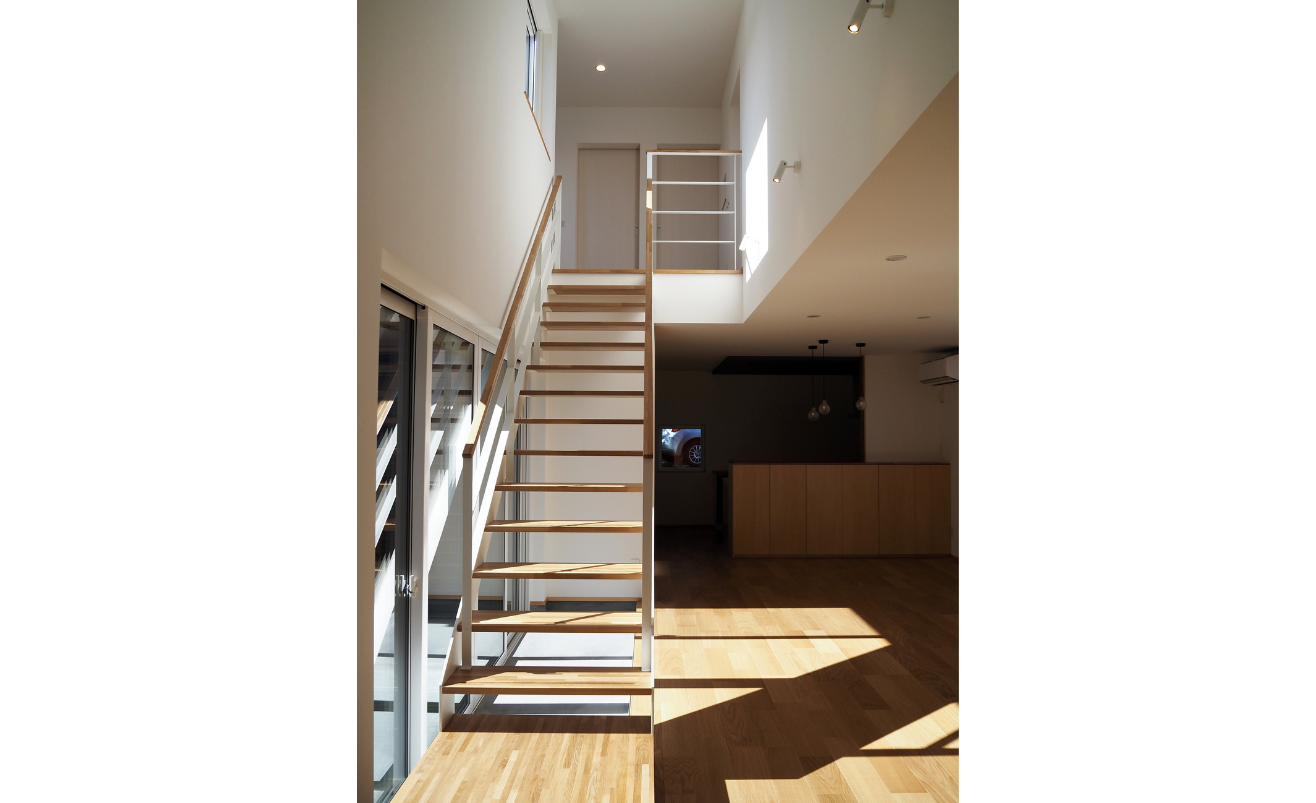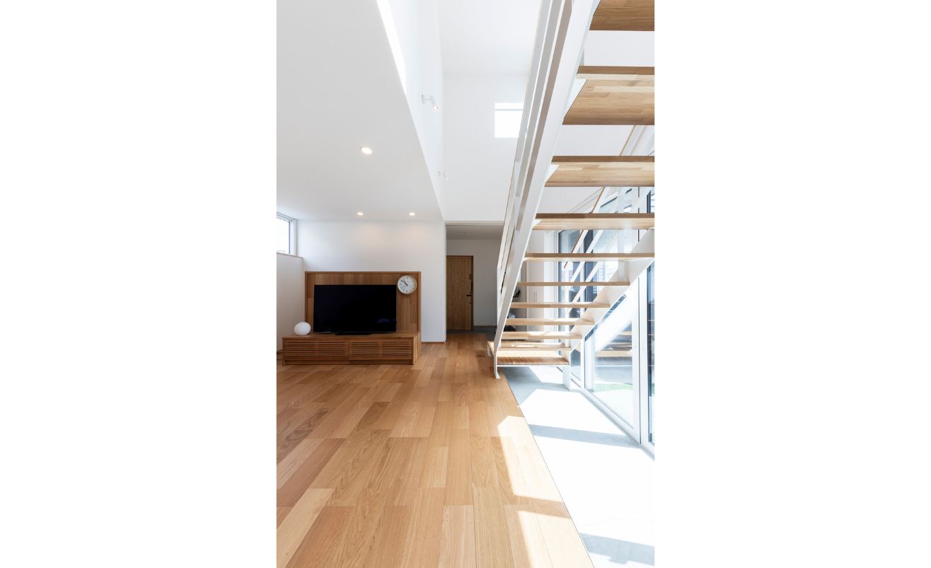 リビングの階段はスケルトンとし、階段吹き抜けを通してリビングスペースに自然光を取り込みます。家の中にいながら外部の自然を感じることができ、のびのびと過ごせる空間が完成しました。