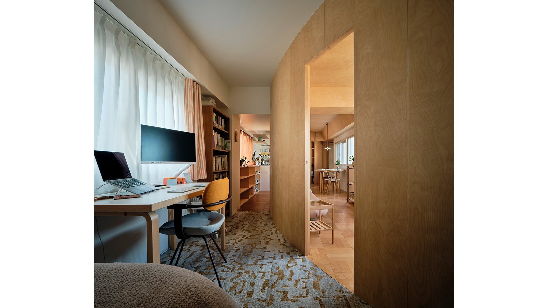 正円の外側には、キッチン、サニタリーやオフィススペースなどの生活に必要な空間を配置。円形の壁が、広がりを感じさせるエリアと少し狭く感じるエリアを作り出し、空間に自然な仕切りを与えます。