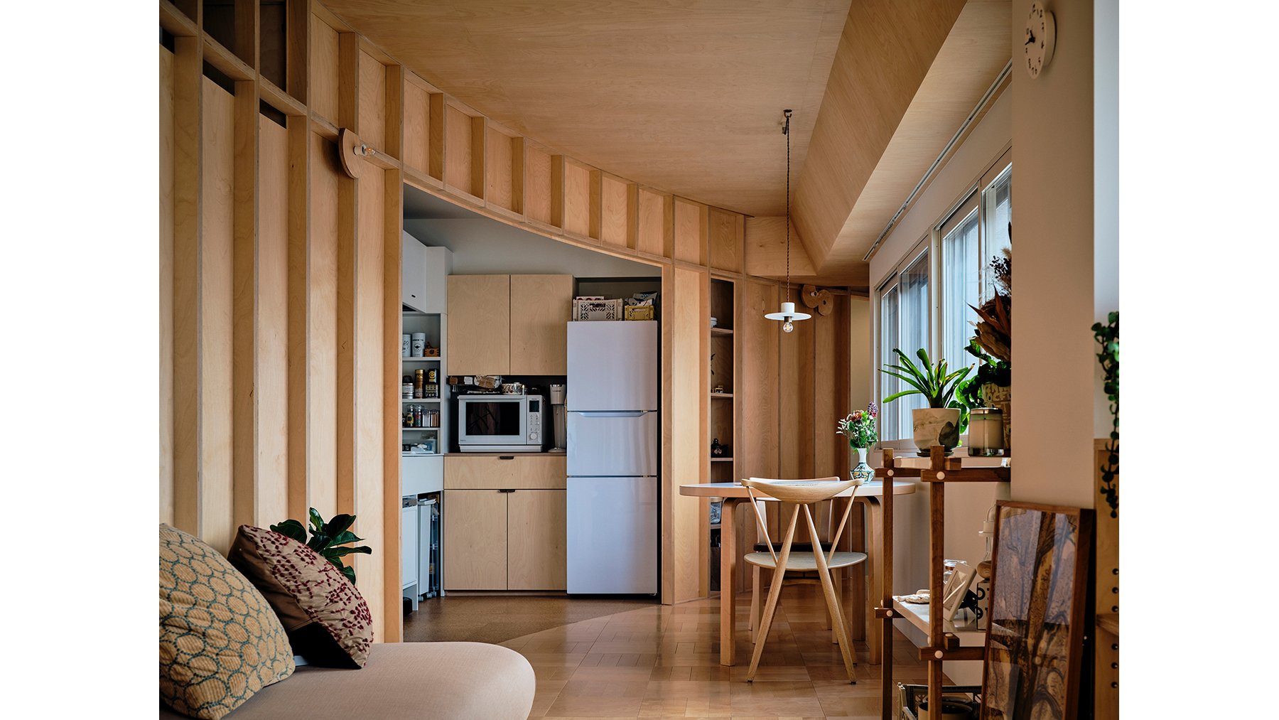 68.3㎡のユニークなL型の住戸は、2人暮らしに十分な広さがあり、住み手からは余白をうまく活用したプランを求められました。この要望に応えるために、正円の壁を設けるアイデアを提案。この壁が、生活に必要な空間と、自由に活用でき、過ごすことができる余白的空間とを分ける役割を果たしています。