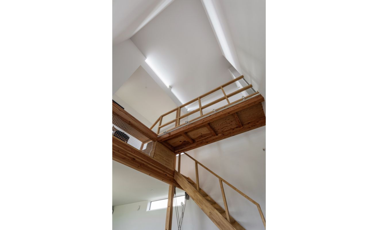 2階にはスタディースペースや寝室、子供部屋を配置。2階部分も渡り廊下を設置したり、各部屋の高さを変え繋げることで、子供が自由に動き回れ、家族の気配を感じながら暮らせる導線に。また開放感溢れる大きな吹き抜けが心地よい空間を作り上げています。その吹き抜けには高窓が設けられ、上から降り注ぐ光が家全体に温かさをもたらし、明るくリラックスできる空間が広がります。土地の形に合わせた縦長の住まいでも、高い吹き抜けが開放感をもたらしています。