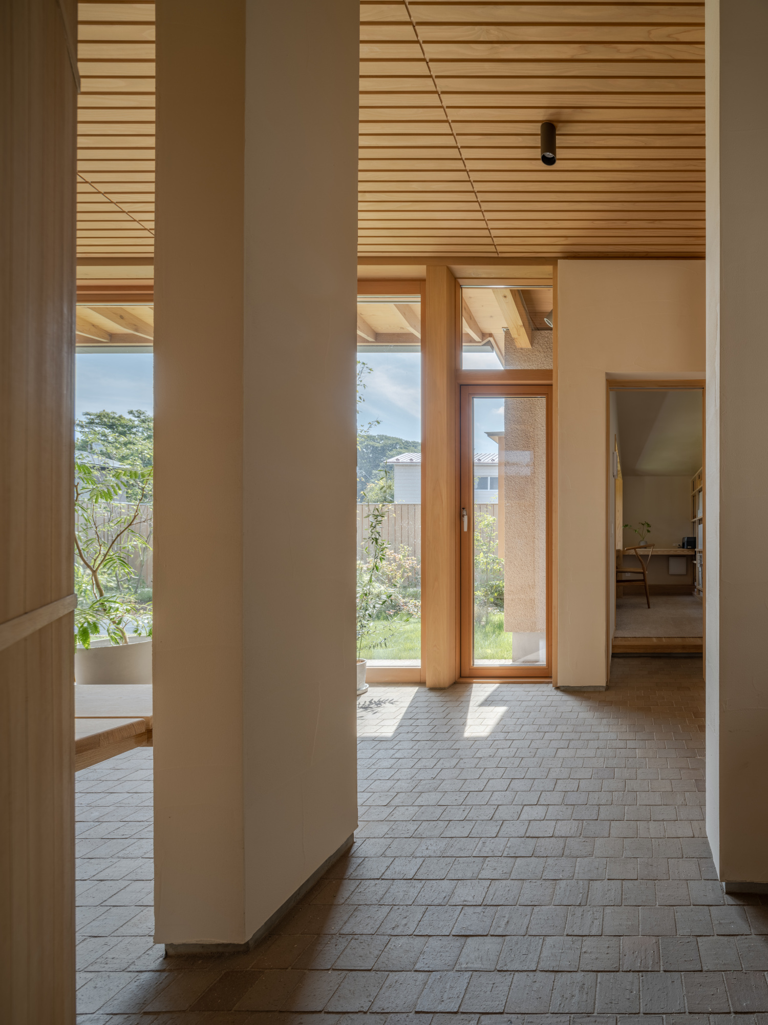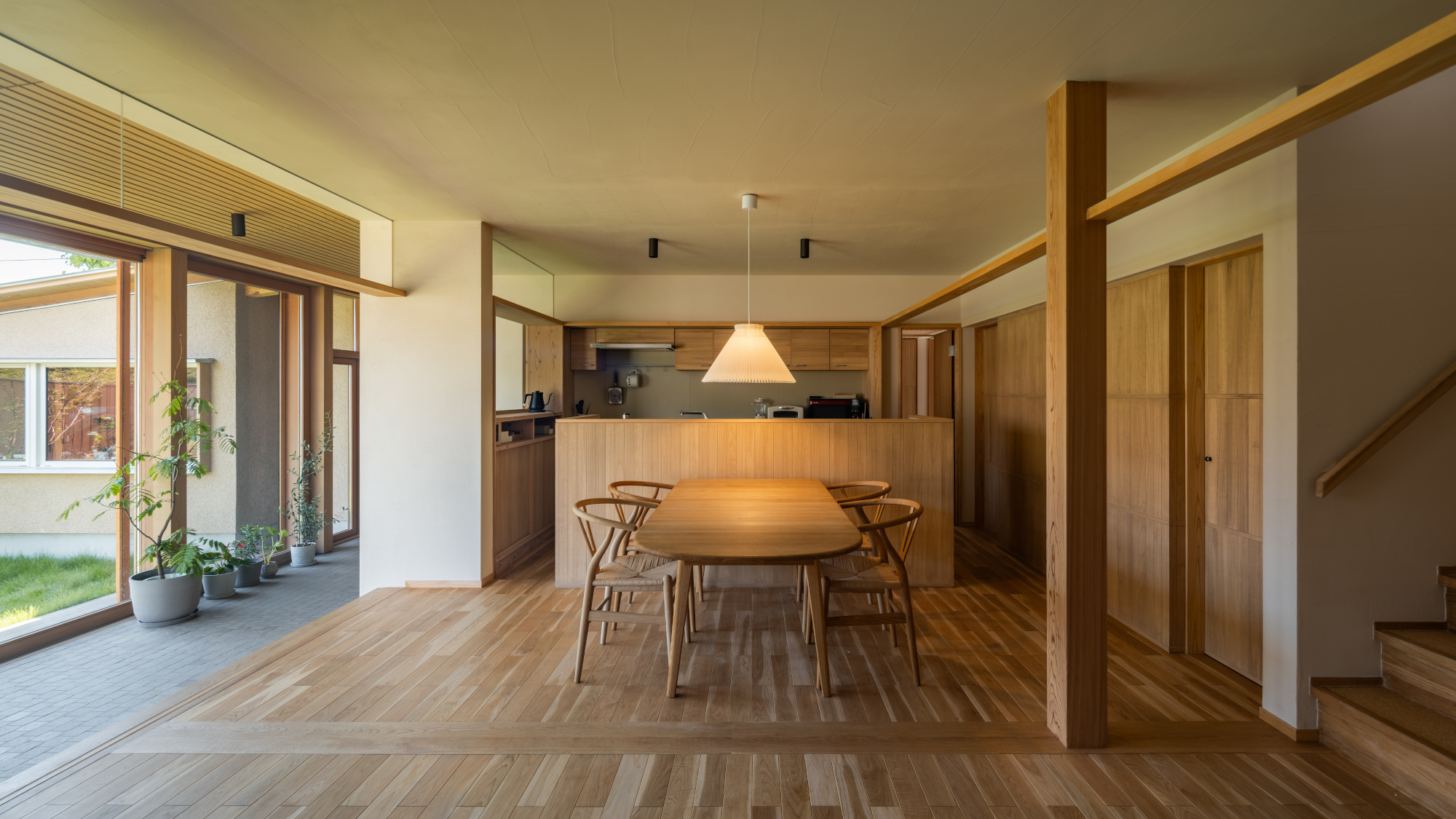 秋田千秋公園の久保田城跡を望む市街地にあるこの住まいは、四季折々の自然を感じることができる場所。住み手の要望で、土に触れ、野菜を育て、子どもが成長できる庭が設けられました。交通の多い道路から奥まった南側に庭を配置し、L字型の通り土間が家の中心へと導きます。進むにつれて外の喧騒を避け、プライベートな空間が広がります。