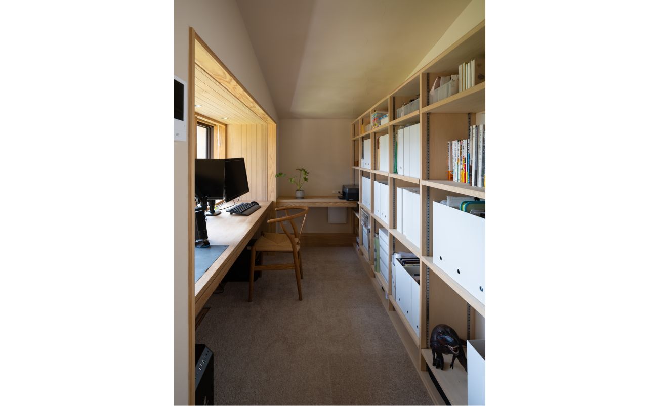 土間は、外物置や靴箱、手洗いなどを兼ね備え、家に入る動線をスムーズに繋げます。庭側の土間はガラス張りで、夏は縁側、冬はサンルームとして居住空間と庭を繋げ、季節を感じながら過ごせます。居住スペースは南側に大きな窓を開け、冬は暖かく、夏は涼しい設計です。奥様の在宅ワークスペースは庭を挟んでリビングと直角に配置。家族の様子をいつでも感じながら集中できる空間に。