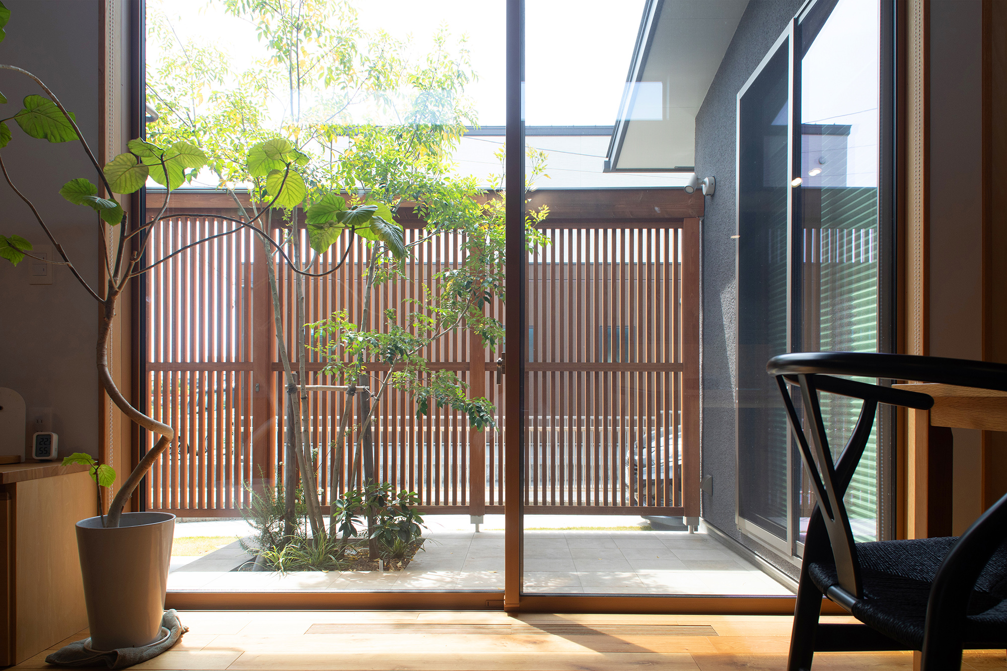 屋根成りの勾配天井を取り入れた室内は、開放感を感じさせながらも落ち着いた雰囲気が漂い、居心地の良い空間が広がります。LDKの南側には、プライベートな中庭が広がり、そこから差し込む自然光が室内を温かくし、そして潤いを与えてくれます。中庭を眺めながら過ごせるこの空間は、日々の生活に心地よい安らぎをもたらします。