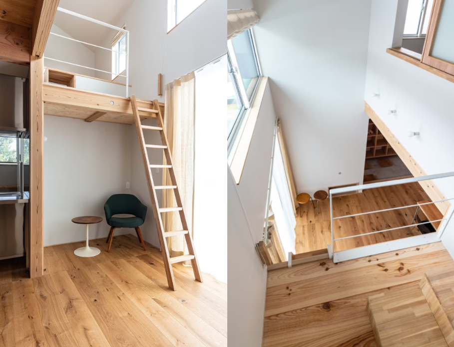 リビングには2階へとつながる梯子を設け、回遊できる動線を確保。これにより、家全体がつながっているような一体感が生まれています。