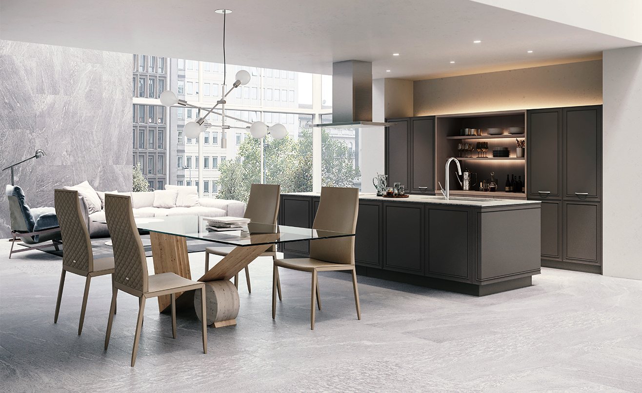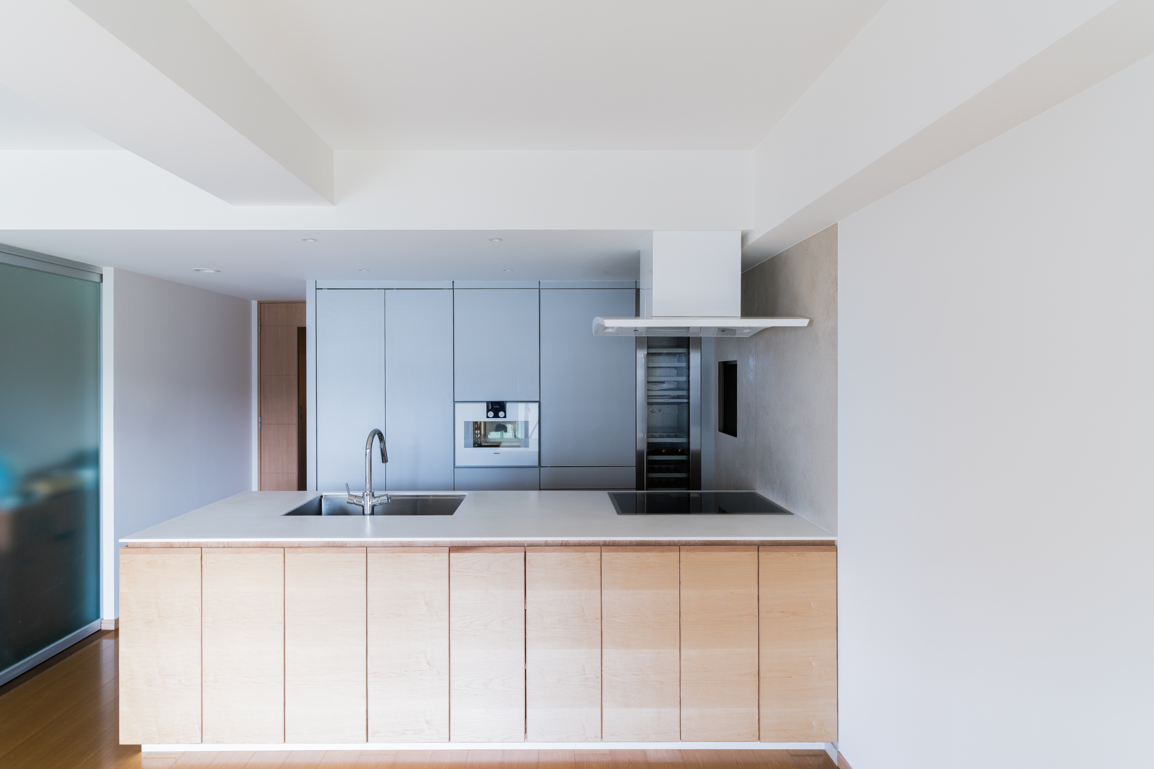 住まいからの眺望があまり良くないことから、縦長の住まいの特徴を生かし、対角線を意識した視線の抜けや、住まいの中で遠くを見渡せる構成を取り入れることで、室内に開放感をもたせました。