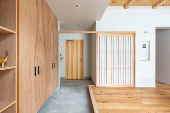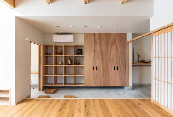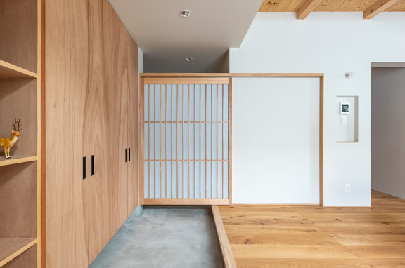 また、ひとつの空間に玄関・土間・LDKが備わるため、玄関正面には障子の引き戸を採用しています。玄関を入るとすぐにLDKが広がる間取りも、ワンクッション設けることで、来客時もプライバシーが確保でき安心です。