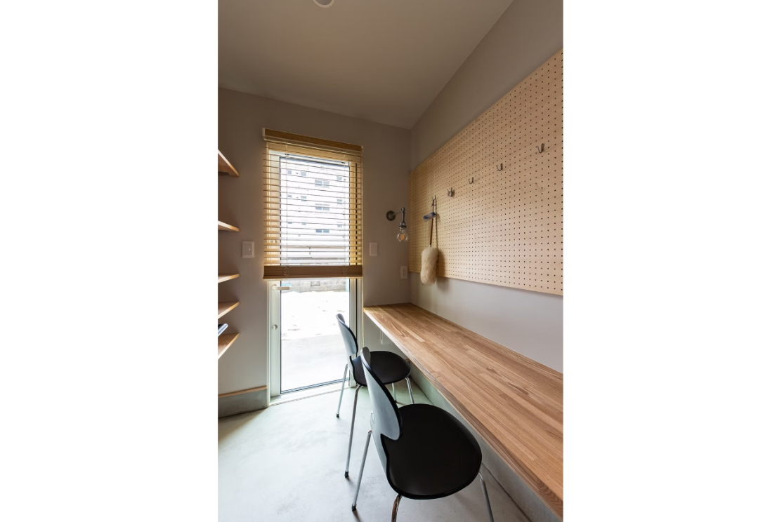 細長い敷地と、建物の外に庭までの通路を確保することが難しいという環境から、「住まいの中に道をつくる」発想で、玄関から庭へと直接アクセスできる土間空間を設計しました。さらに、その道中に書斎を設けることで、屋外とつながるワークスペースとなり、デスクワークはもちろん、外仕事の作業や、お子様の趣味スペースとしても使える、室内の書斎とは違った可変性のある空間となっています。