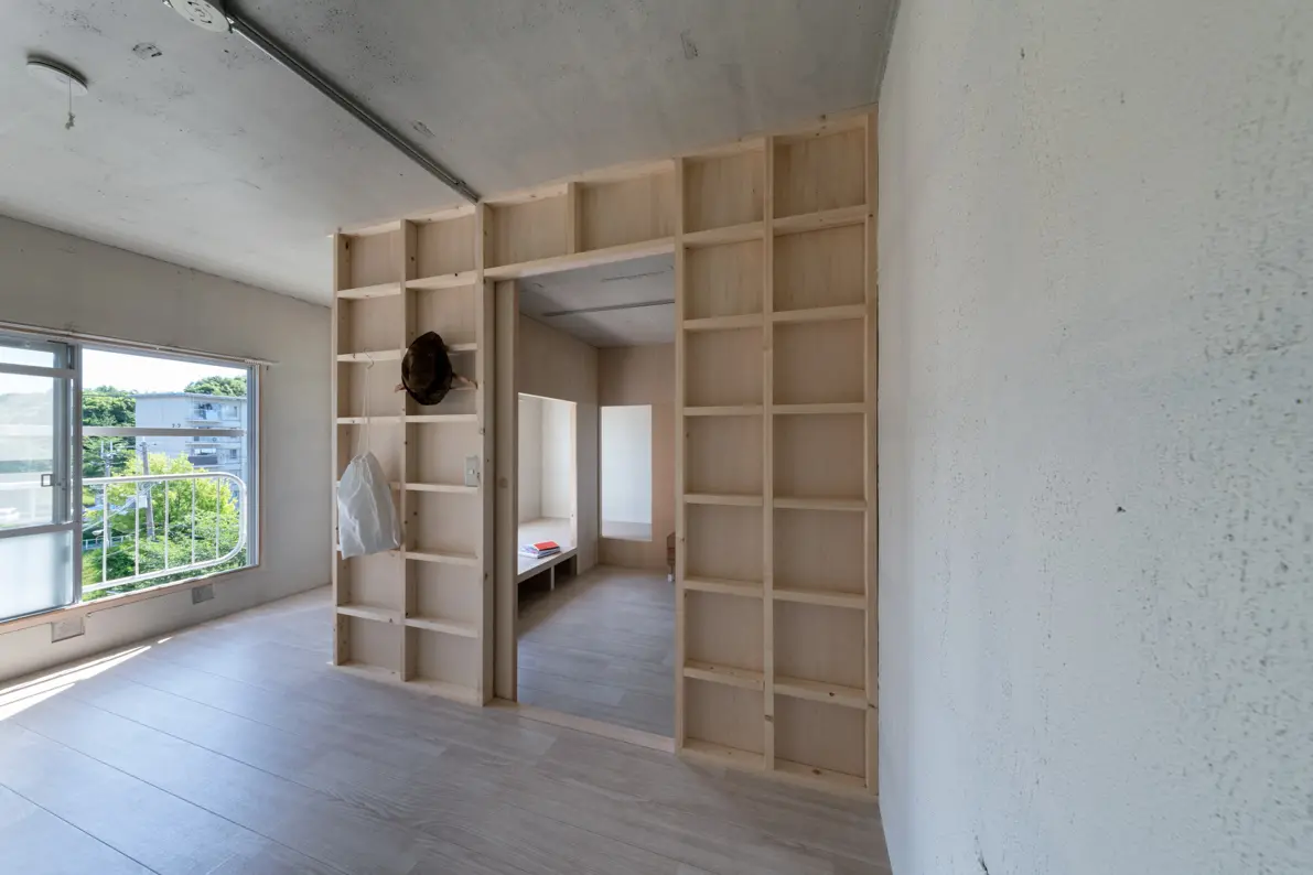 今回のリノベーションでは、単に部屋を作るのではなく、多機能を兼ね備えた壁を住まいの中心にロの字型に配置することで、既存の団地の間取りに囚われない、新しい空間となりました。